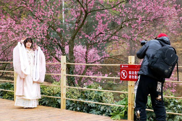 汉服爱好者在贵州梅园里拍摄“听说贵州梅园开园了,就按捺不住前来赏梅拍照打卡。”张晖笑着说道,手中的相机仍在不停运作。镜头下,梅园里的各种梅花竞相绽放,花瓣凝霜带露,楚楚动人;蜿蜒小径穿梭梅林,亭台楼阁错落其间,一步一景皆成画。