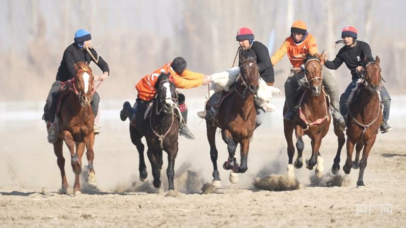 在麦盖提县,首届“刀郎杯”全疆刁羊赛马争霸赛的赛场上,骑手们闻令而动,尽显精湛马背技艺 (央广网发 吾斯曼・麦麦提 摄)