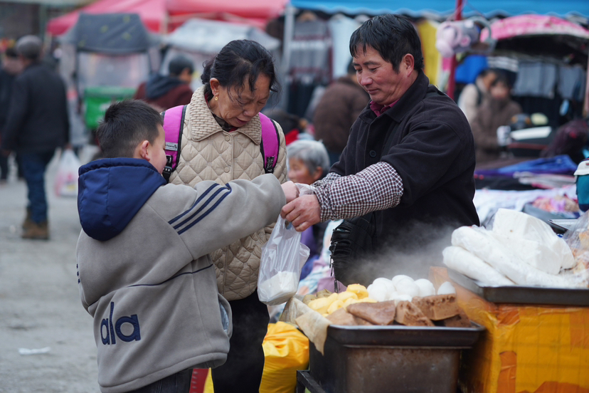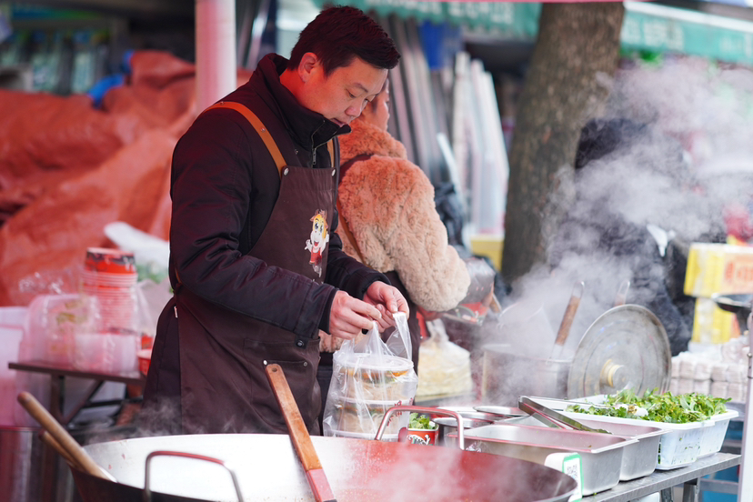 周三,冷风吹。贵安新区党武街道集市上的腾腾热气,却将寒风再次挡住。