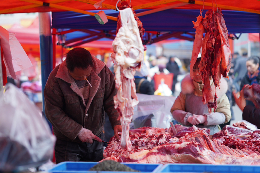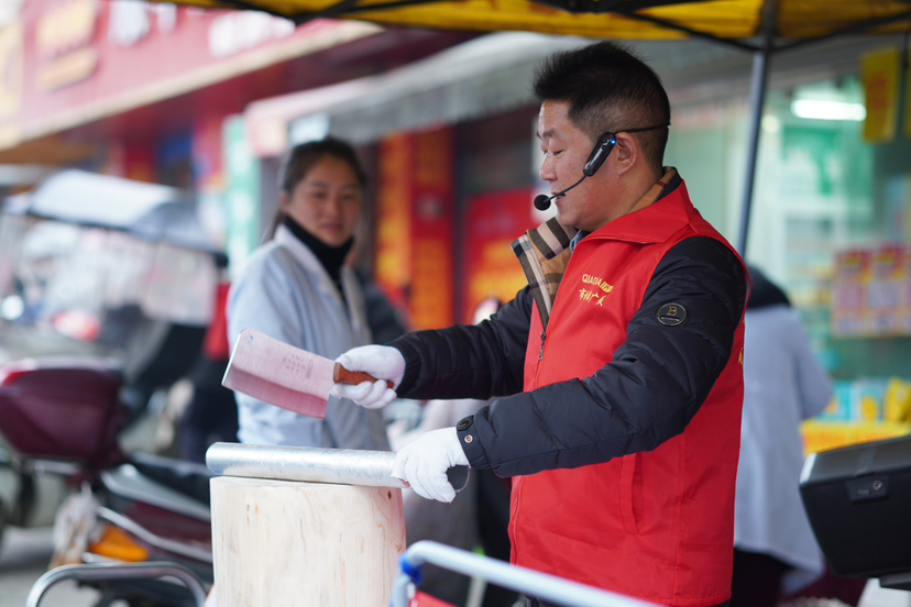 有人的地方就有江湖,有肉的地方就有菜刀。肉摊旁,一位年轻人将手中的菜刀舞得呼呼生出风来。
