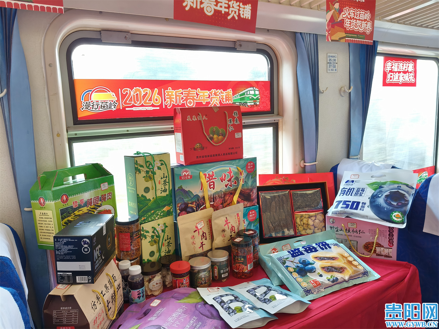 “火车过苗岭,年货贺新春。”3号车厢是列车超市、年货优选铺,酸汤底料、高山茶叶、腊肉香肠、牛肉干等特产琳琅满目,包装上印着的“村火车优选”字样格外醒目。