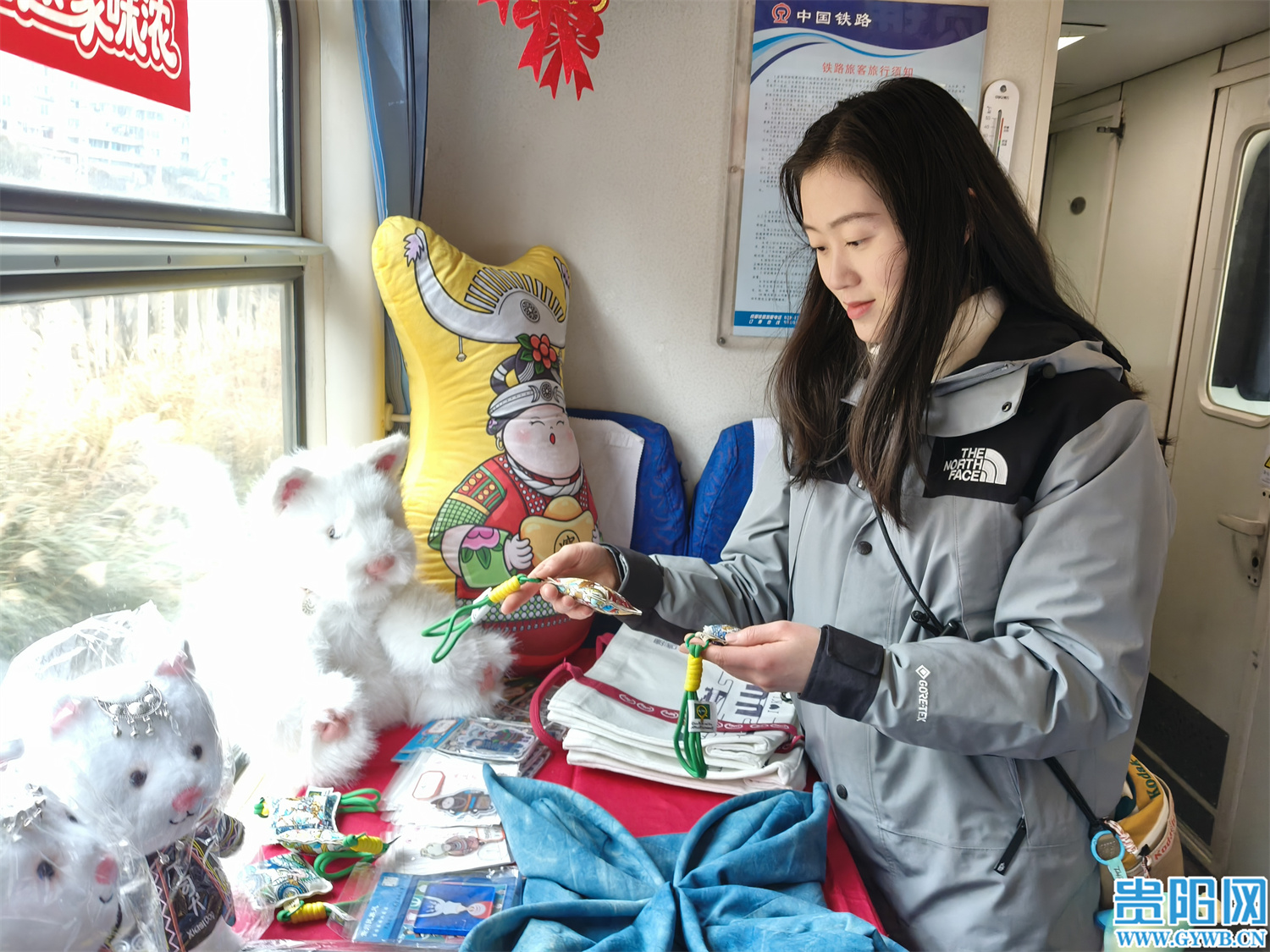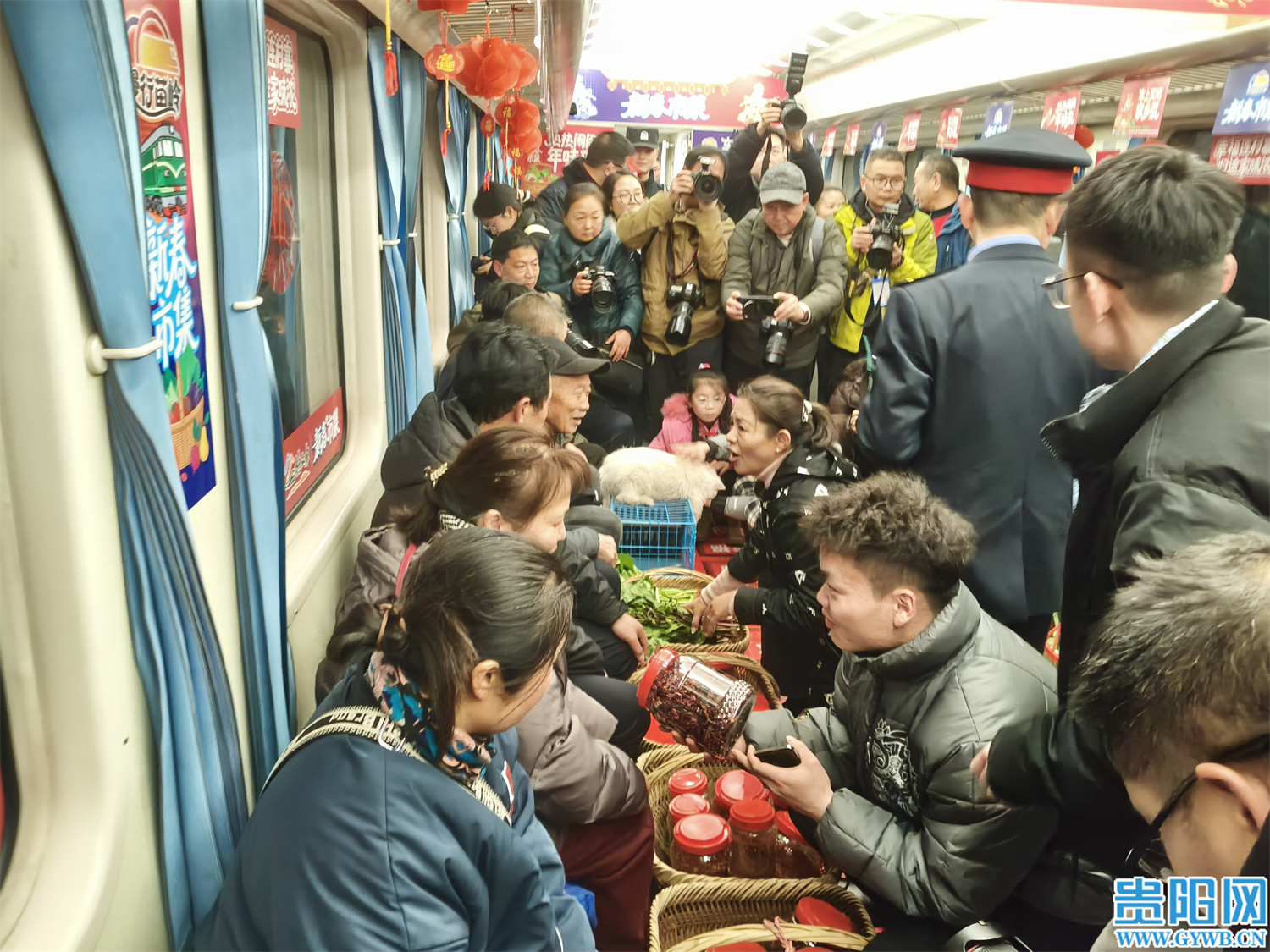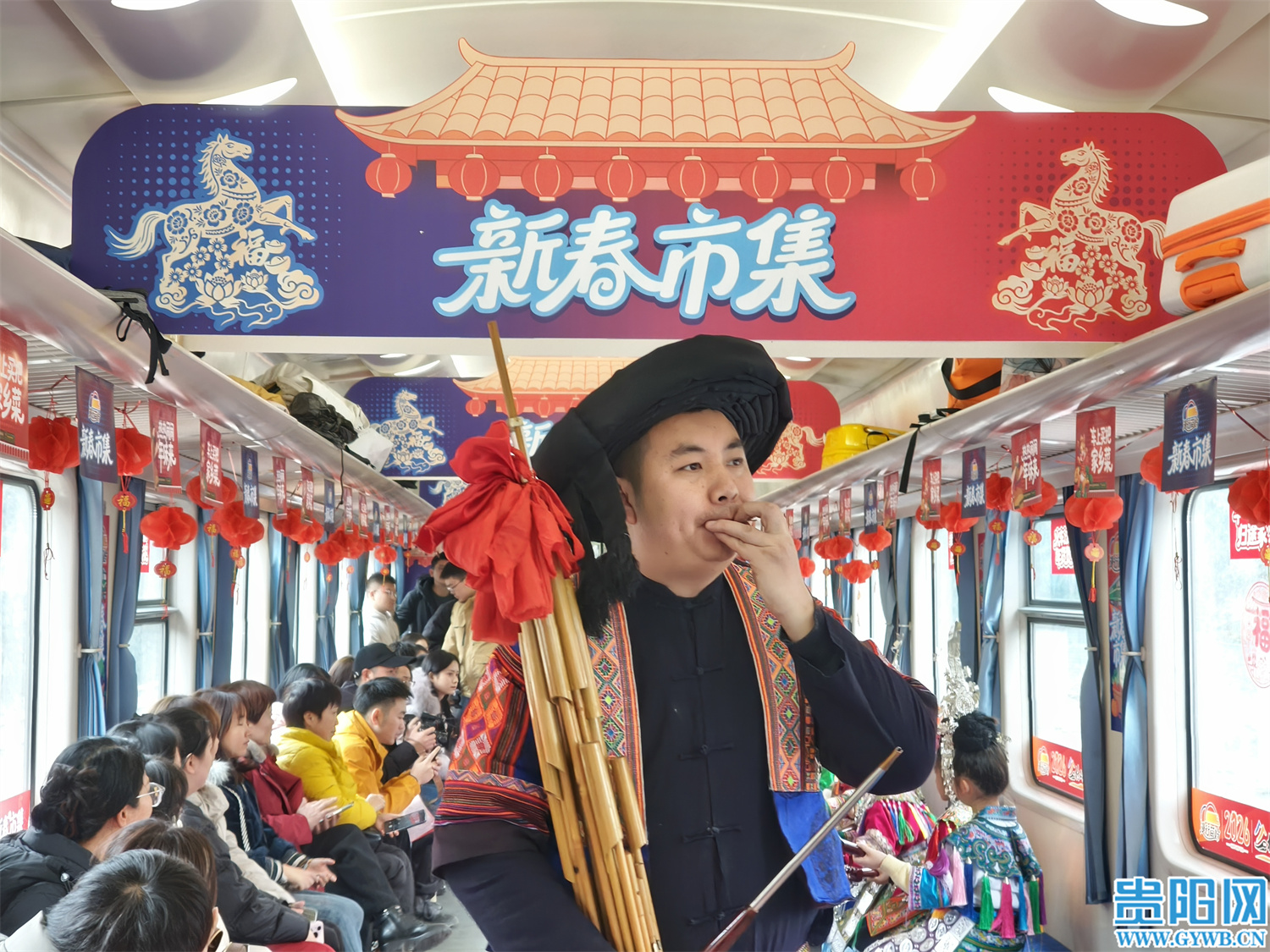 旅客们刚踏入车厢,就被浓郁的年味包裹:大红灯笼挂满车顶,春联剪纸点缀车窗,各色年货扑面而来,空气中隐约飘来酸汤的鲜香与茶叶的清香。