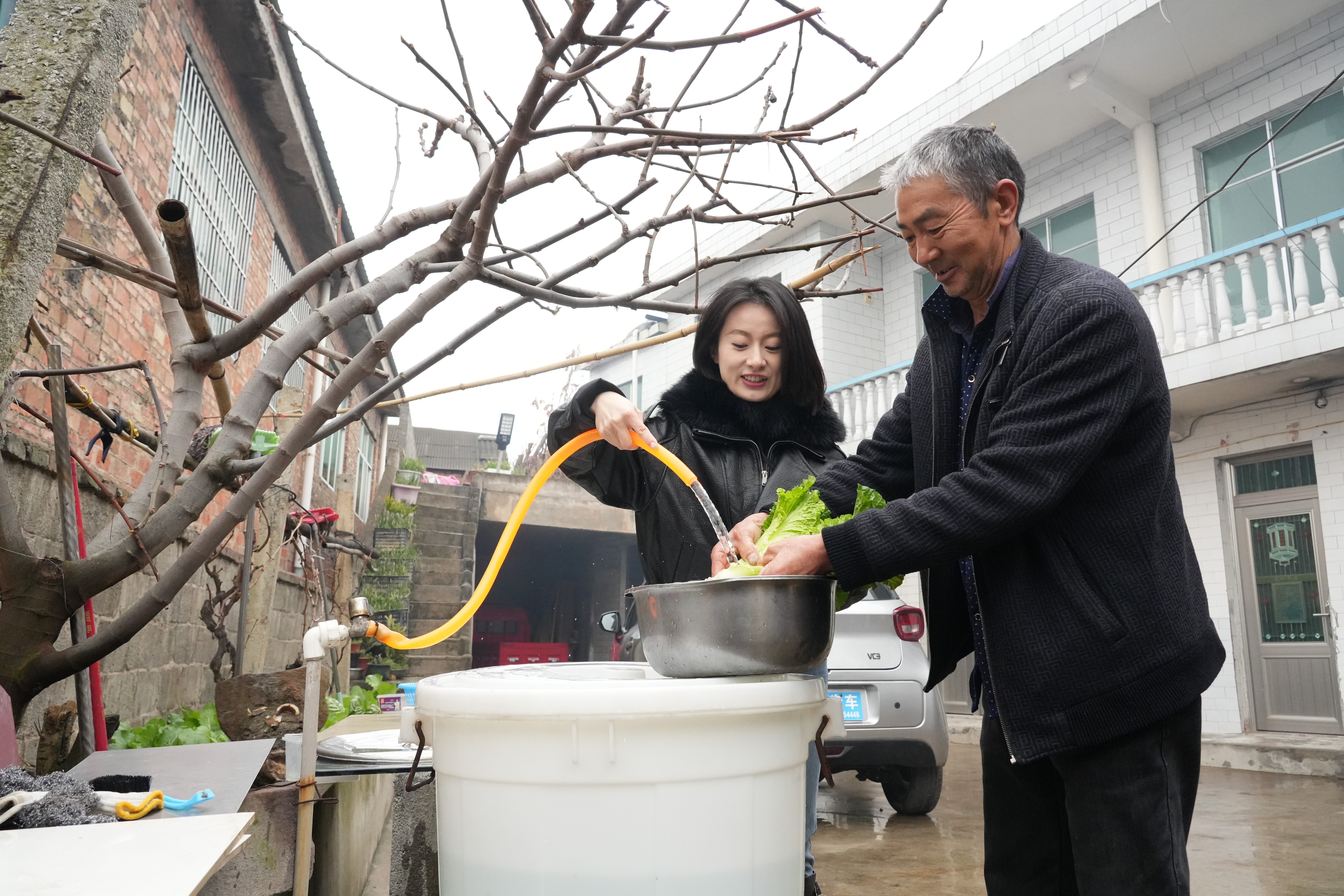 问政记者(左)帮着村民周泽林(右)洗白菜,周泽林脸上露出喜悦的笑容。