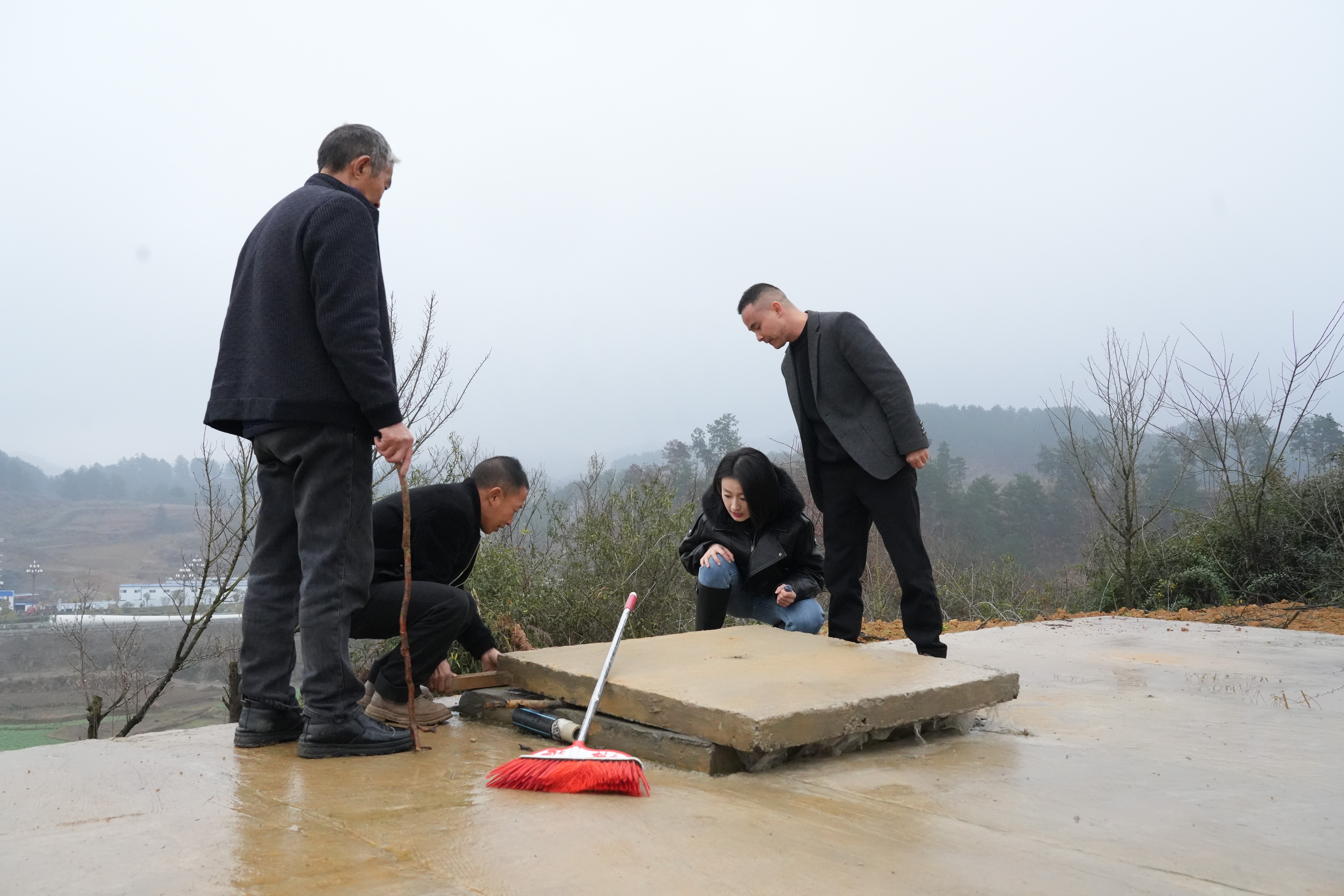 大青村党支部书记周杰(右一)与村民带着问政记者查看蓄满水的高位水池。