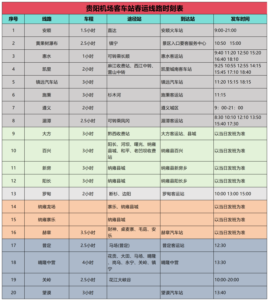 为方便归乡旅客,贵阳机场客运站整理了春运期间车站的时刻表,以供大家查询。
