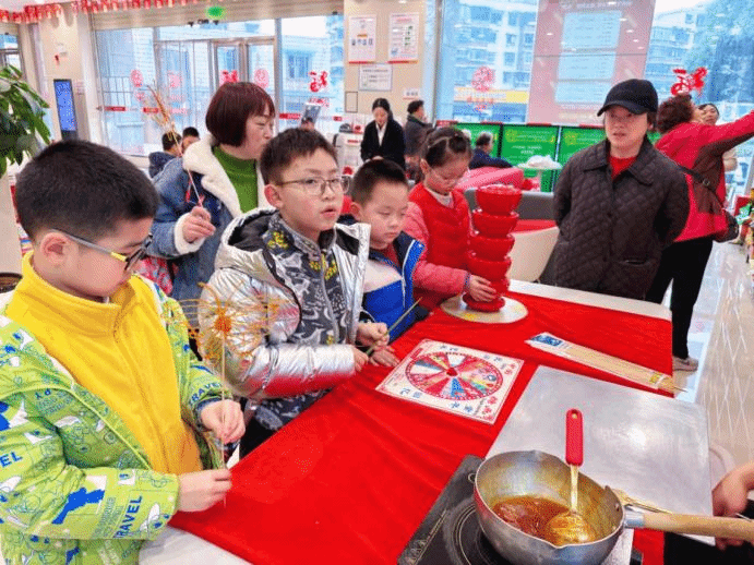 活动期间,支行精心策划了多元化体验活动,让孩子们在欢声笑语中开启金融启蒙之旅。在“魔力金融”小丑魔术秀活动中,滑稽可爱的小丑凭借神奇魔术点燃现场氛围,孩子们全程热情高涨,活动中穿插的基础货币知识问答,让金融知识变得通俗易懂,助力孩子迈出金融认知第一步;在“味蕾探险”的美食活动中,孩子们亲手参与美食制作与品尝,在体验劳动与分享乐趣的同时,通过比价、计算优惠等互动环节,初步理解货币的购买价值,学会区分“想要”与“需要”,在实践中培育成本意识;“非遗糖画 甜蜜传承”活动特邀非遗手艺人现场献艺,金黄的麦芽糖浆在师傅手中流转勾勒,化作一个个精致可爱的糖画作品,孩子们在感受非遗文化魅力的同时,领悟到“储蓄如制糖画,唯有耐心积累,方能收获美好”的道理;还有川剧变脸表演惊艳登场,一张张变幻的脸谱让孩子们惊叹不已,工作人员借机引申“财富面孔”的多重含义,向孩子们讲授财产安全与保值增值的重要知识;“拓印送福 储值未来”迎新春活动则将传统拓印技艺与新春祝福、储蓄理念相结合,孩子们亲手拓印“福”字,将“福气”与零花钱一同存入银行,更加直观理解储蓄意义。