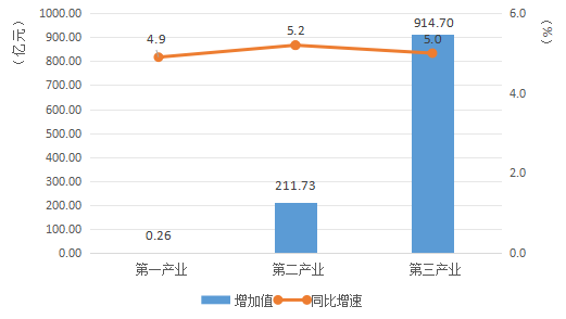 分产业看,第一产业增加值1.40亿元,增长4.8%;第二产业增加值292.65亿元,增长2.6%;第三产业增加值913.00亿元,增长6.3%。