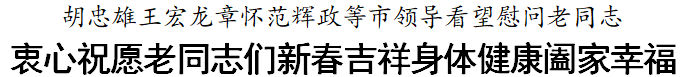 贵阳网·贵阳新闻讯 在马年新春即将来临之际,省委常委、市委书记胡忠雄,市委副书记、市长王宏,市政协主席、市委常委、市委组织部长龙章怀,市委副书记范辉政等市领导分别看望慰问部分副地级以上老同志,向全市老同志们致以诚挚的节日问候,衷心祝愿他们新春吉祥、身体健康、阖家幸福。