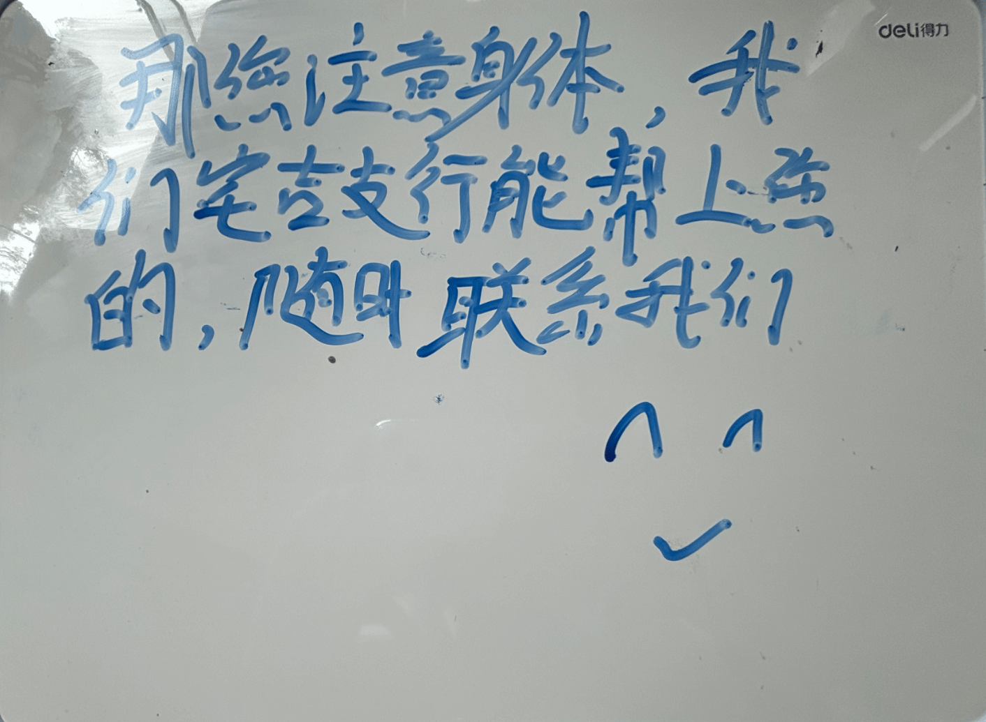 考虑到客户沟通需求,工作人员立即取出支行配备的 “爱心交流板”,用文字进行交流。沟通过程中,工作人员逐句问询客户诉求、细致核实业务信息,从需求确认、政策解释,到暖心叮嘱“你多注意身体”,全程将关键信息清晰呈现于白板之上,客户也通过点头、指认文字的方式,顺畅完成互动回应。
