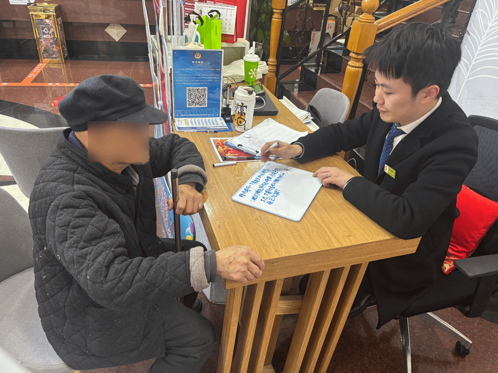 在近20分钟的沟通中,工作人员始终保持耐心,利用肢体动作辅助表达,最终协助客户顺利完成业务办理。在离开时,工作人员搀扶老人下楼梯,同时考虑客户家境困难,还贴心赠送一些日常用品。