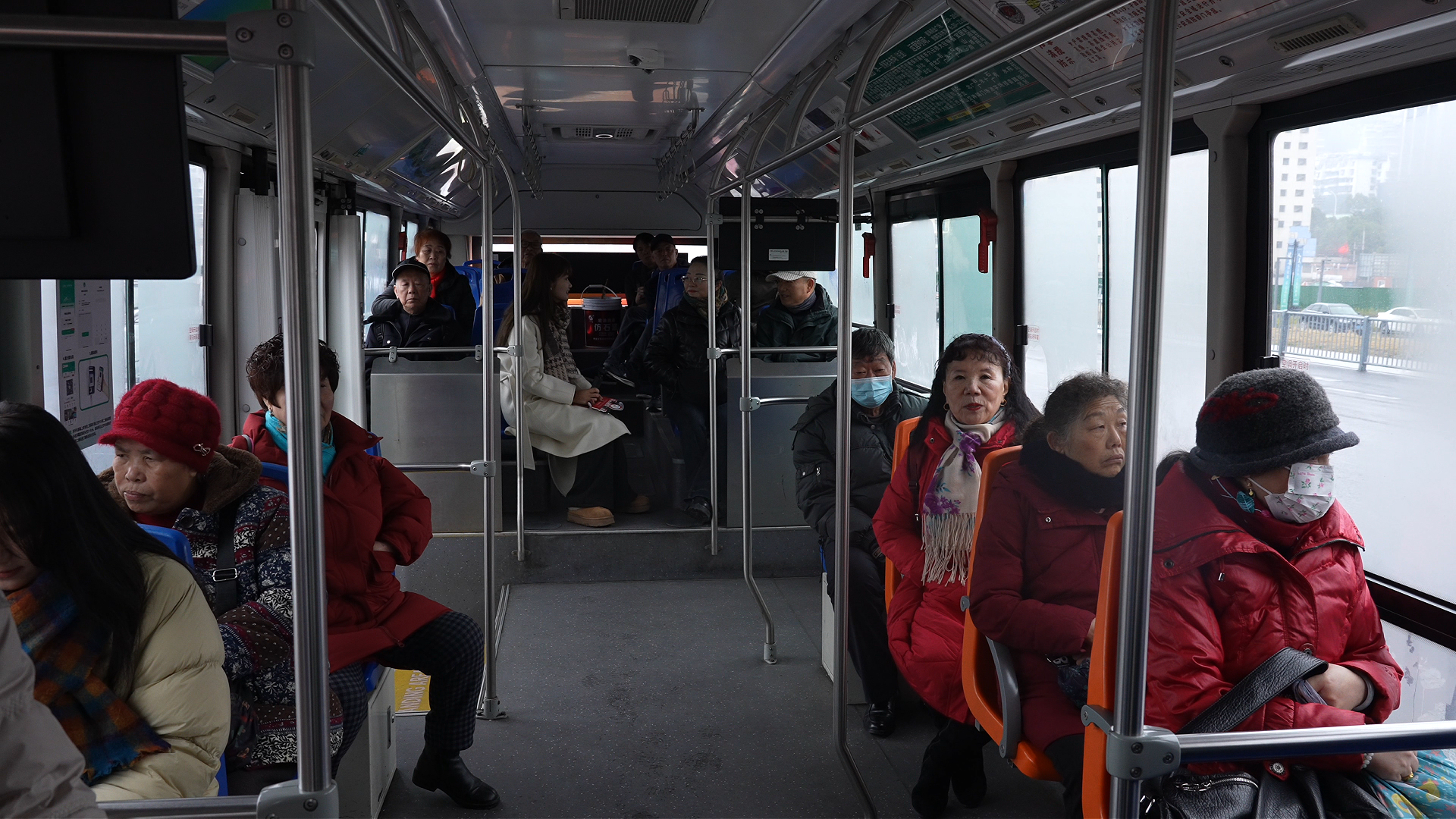 问政记者(左)和温叔叔(右)彭阿姨(中)一同乘坐到贵钢花鸟市场的公交车。