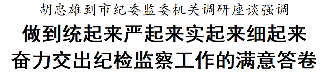 胡忠雄强调,要统起来,进一步增强整体意识,更加注重系统观念、统筹协调、团结协作,凝心聚力抓好全面从严治党和反腐败斗争重点工作,有力推进新时代新征程纪检监察工作高质量发展。要严起来,进一步增强责任意识,把严的基调、严的措施、严的氛围一贯到底,全力扬优势补短板,为在走高质量发展新路上勇于探索、打好头阵、走在前列提供坚强保障。要实起来,进一步增强为民意识,强化执纪执法为民,持续深化群众身边不正之风和腐败问题集中整治,让群众切实感受到正风肃纪反腐就在身边。要细起来,进一步增强斗争意识,按照政治过硬、能力过硬、作风过硬、廉洁过硬的要求,着力锻造一支忠诚干净担当、敢于善于斗争的纪检监察铁军。