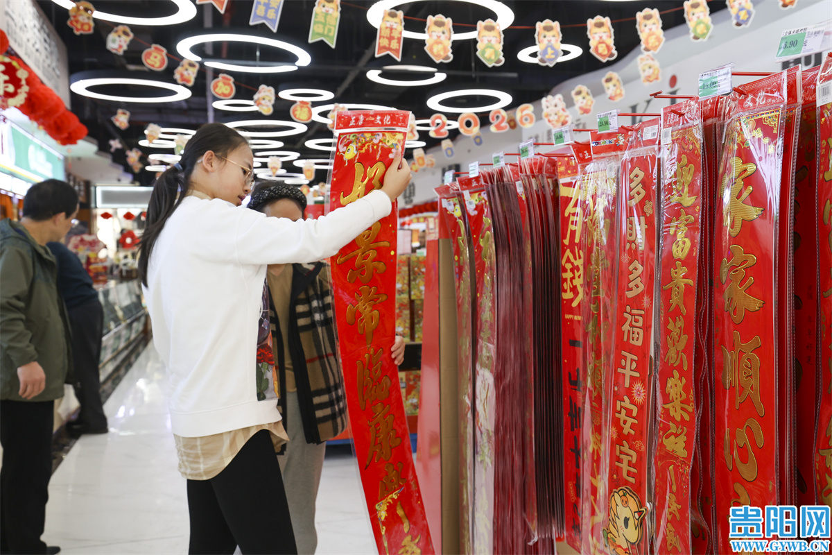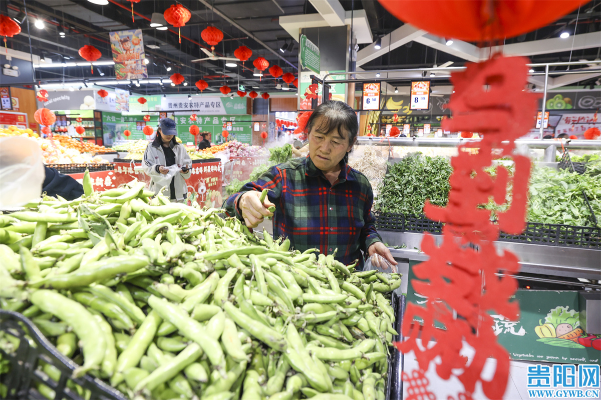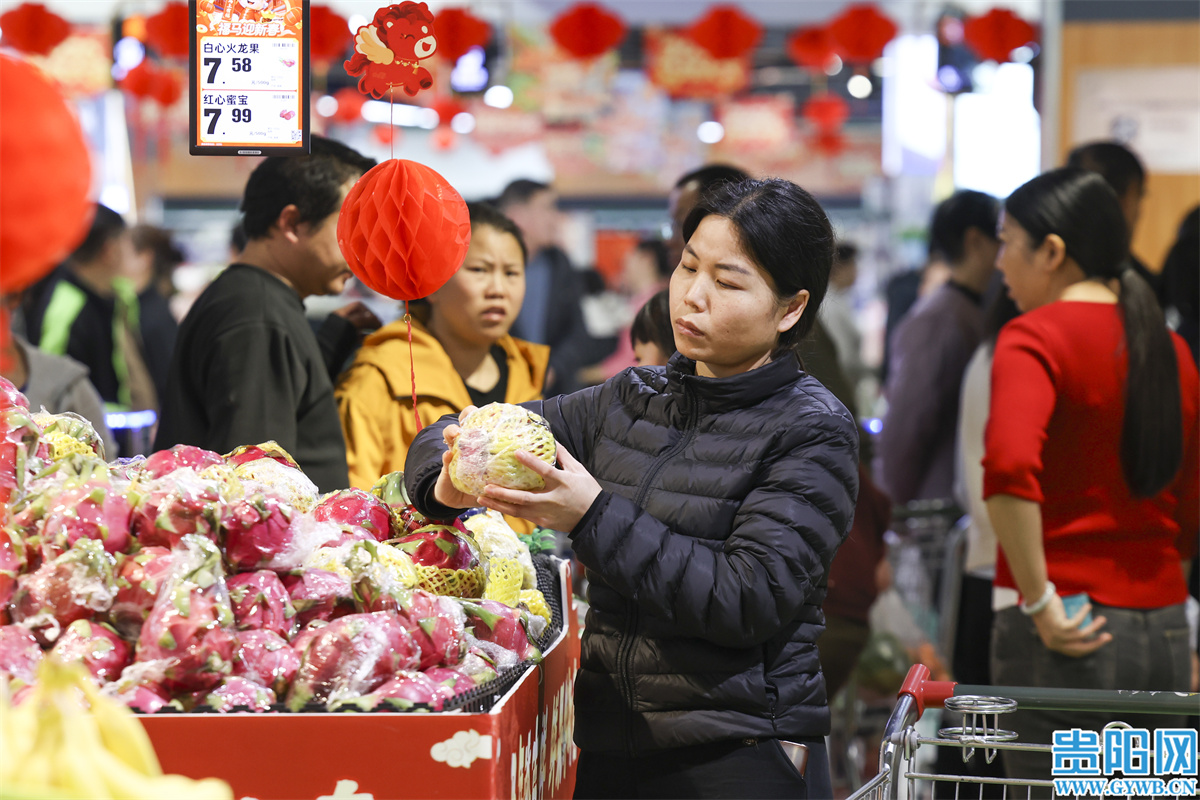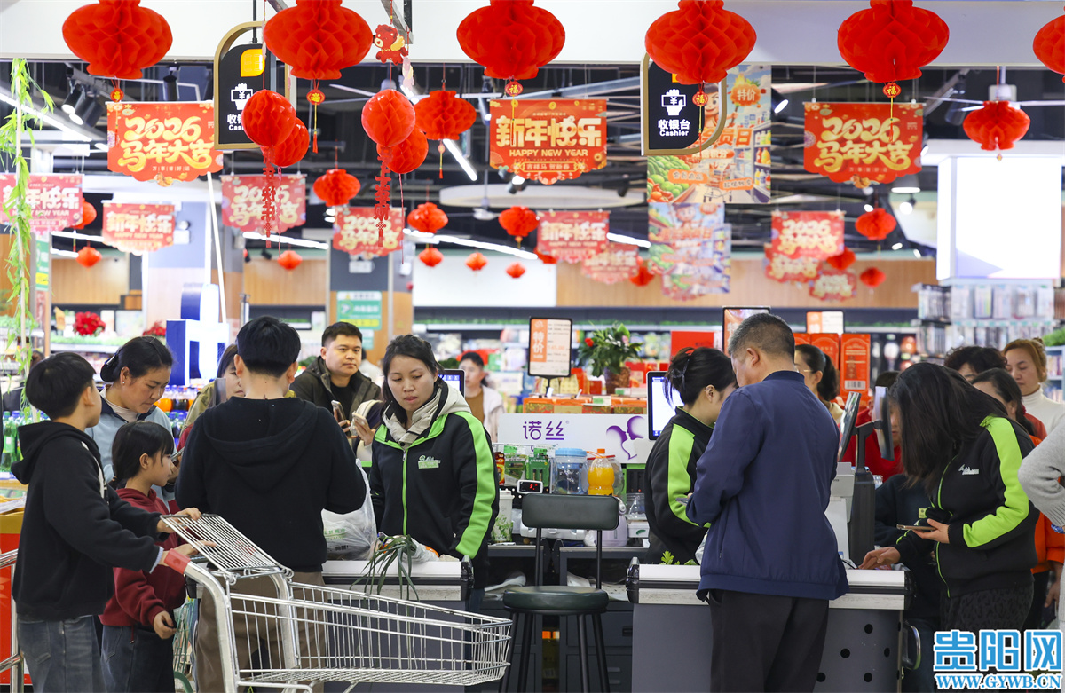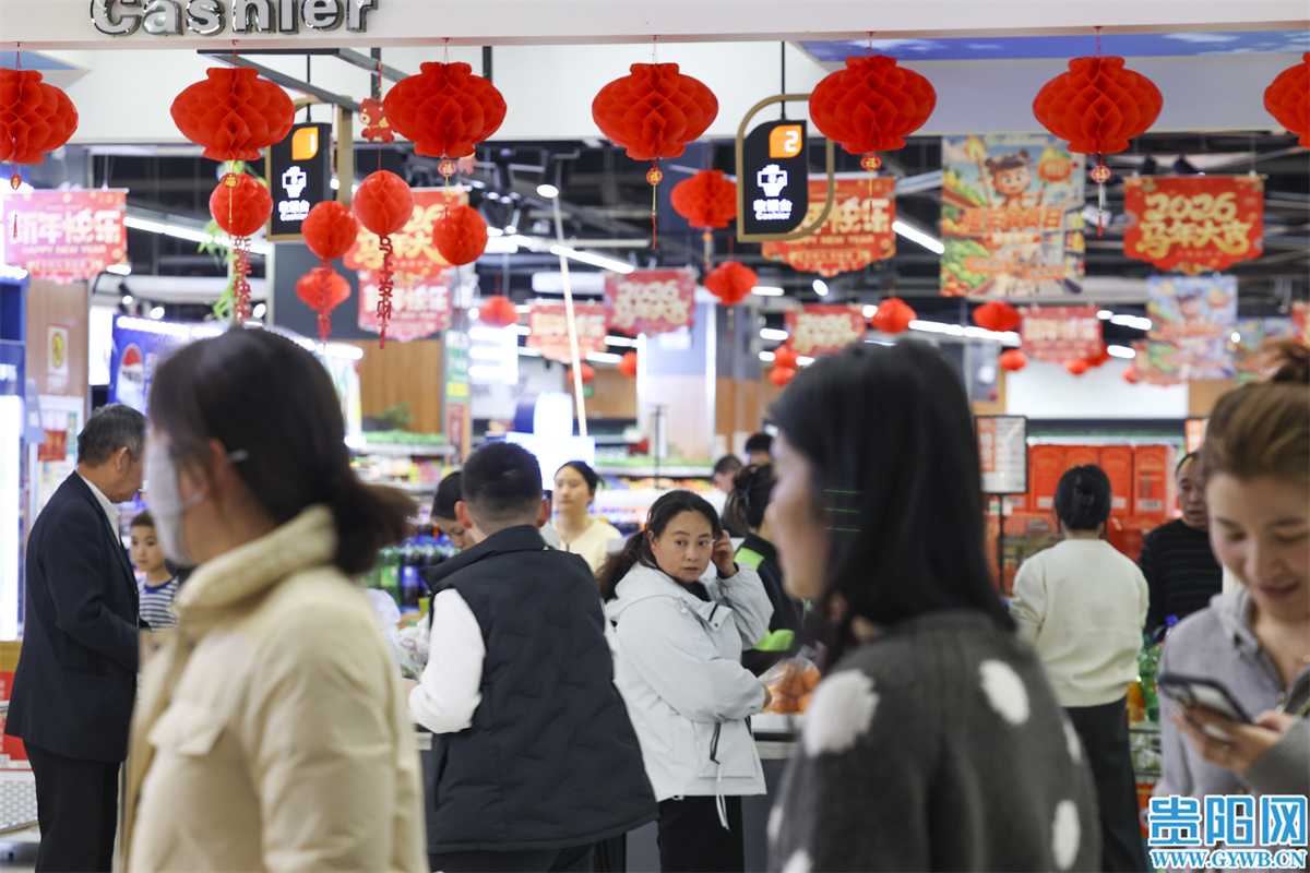 贵阳网·贵阳新闻讯 连日来,位于贵安新区花溪大学城的贵安农源达生鲜超市,前来置办年货的市民络绎不绝,大家推着购物车精心挑选、仔细比对,脸上洋溢着迎接新年的喜悦。收银台前秩序井然,一件件满载心意的年货商品被打包带走,处处人潮涌动、暖意融融,勾勒出一派红火热闹、烟火气十足的新春消费图景,也彰显出贵安新区蓬勃旺盛的节日市场活力。