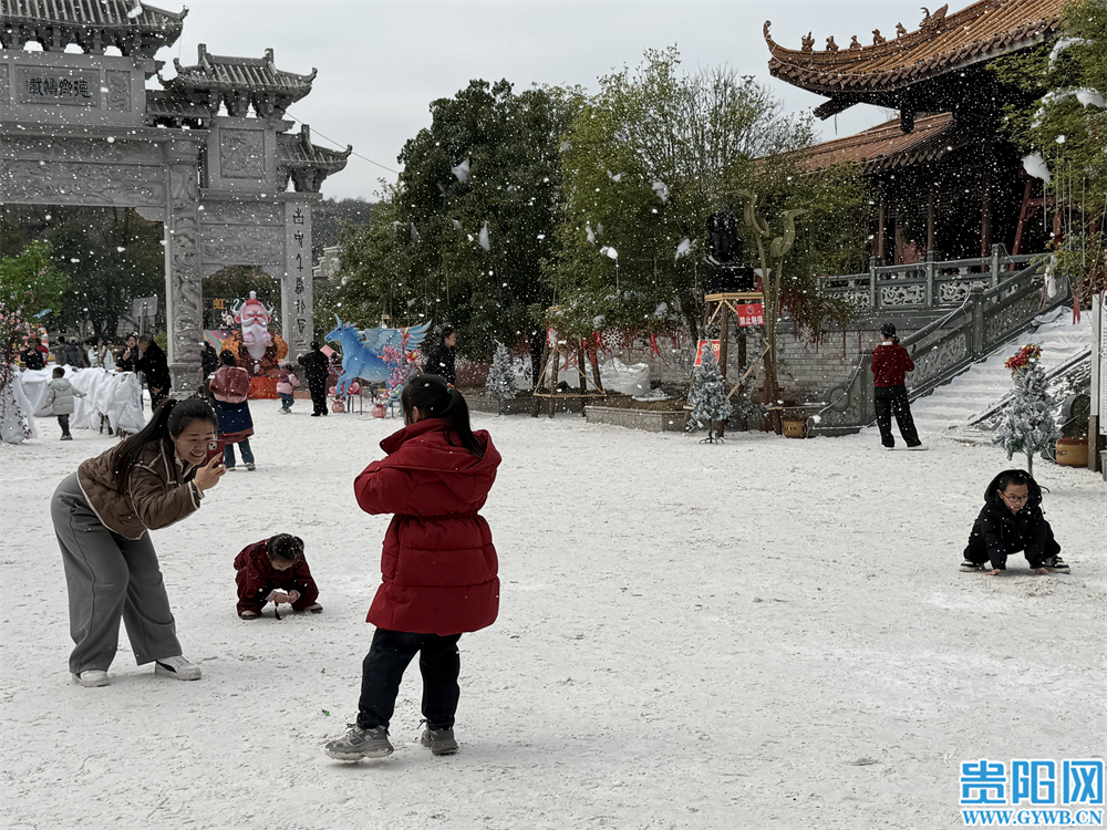 沿着石板路前行,一场人造“瑞雪”为古城增添了几分北国风情。雪花纷纷扬扬,落在古牌坊的雕花上,落在红墙黛瓦间,孩子们在雪地里追逐嬉戏,大人们则忙着在这难得的“雪景”中合影留念,欢声笑语回荡在古城上空。
