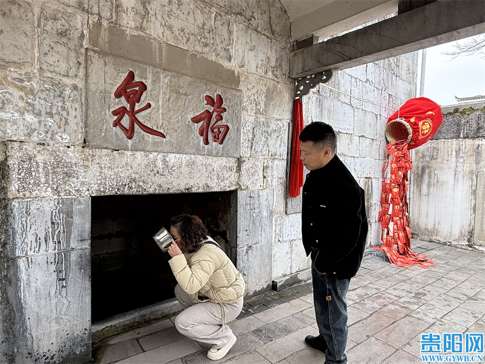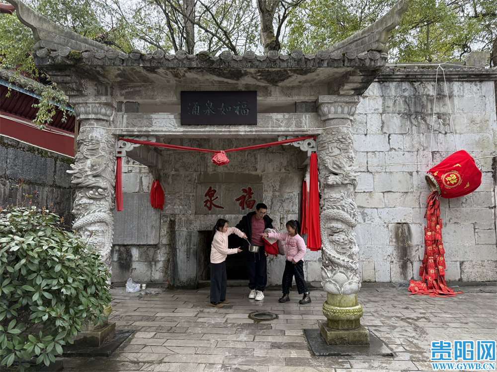 “山不在高,有仙则名”。位于福泉市区的福泉山,山上有一泉名为“福泉”,其水甘甜清冽,据说喝过“福泉”的人就会得到幸福,泉因水得名,山因泉得名,城因山得名。在“福泉”泉眼处,“涌泉如福”的石牌坊下挂满了红色祈福带。市民们手持小桶,虔诚地接取清冽的泉水,希望这“福泉”之水能够带来一整年的幸福安康。一位母亲正指导着孩子接水,脸上洋溢着温馨的笑容。