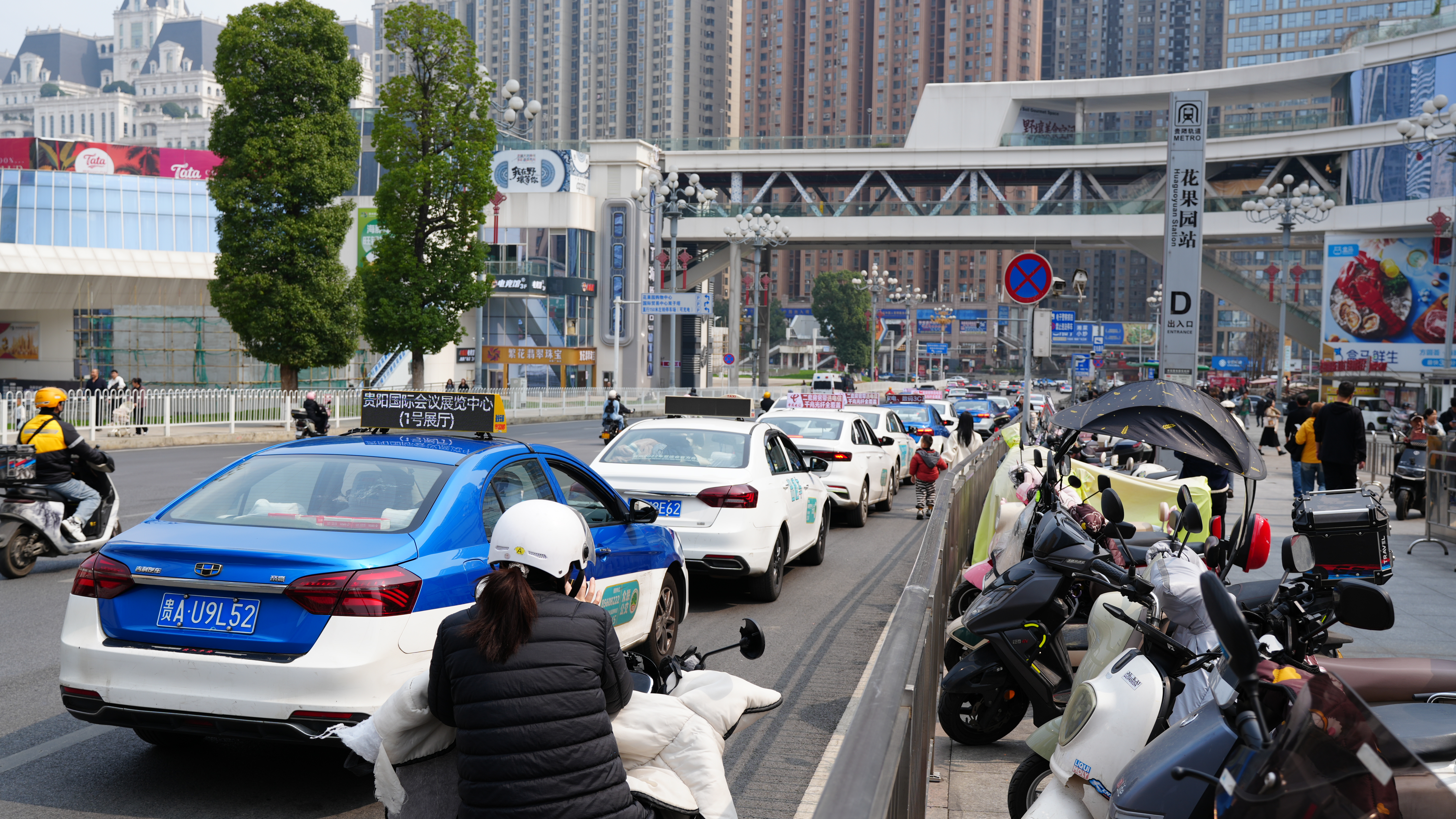 出租车在花果园双子塔公交站候客。