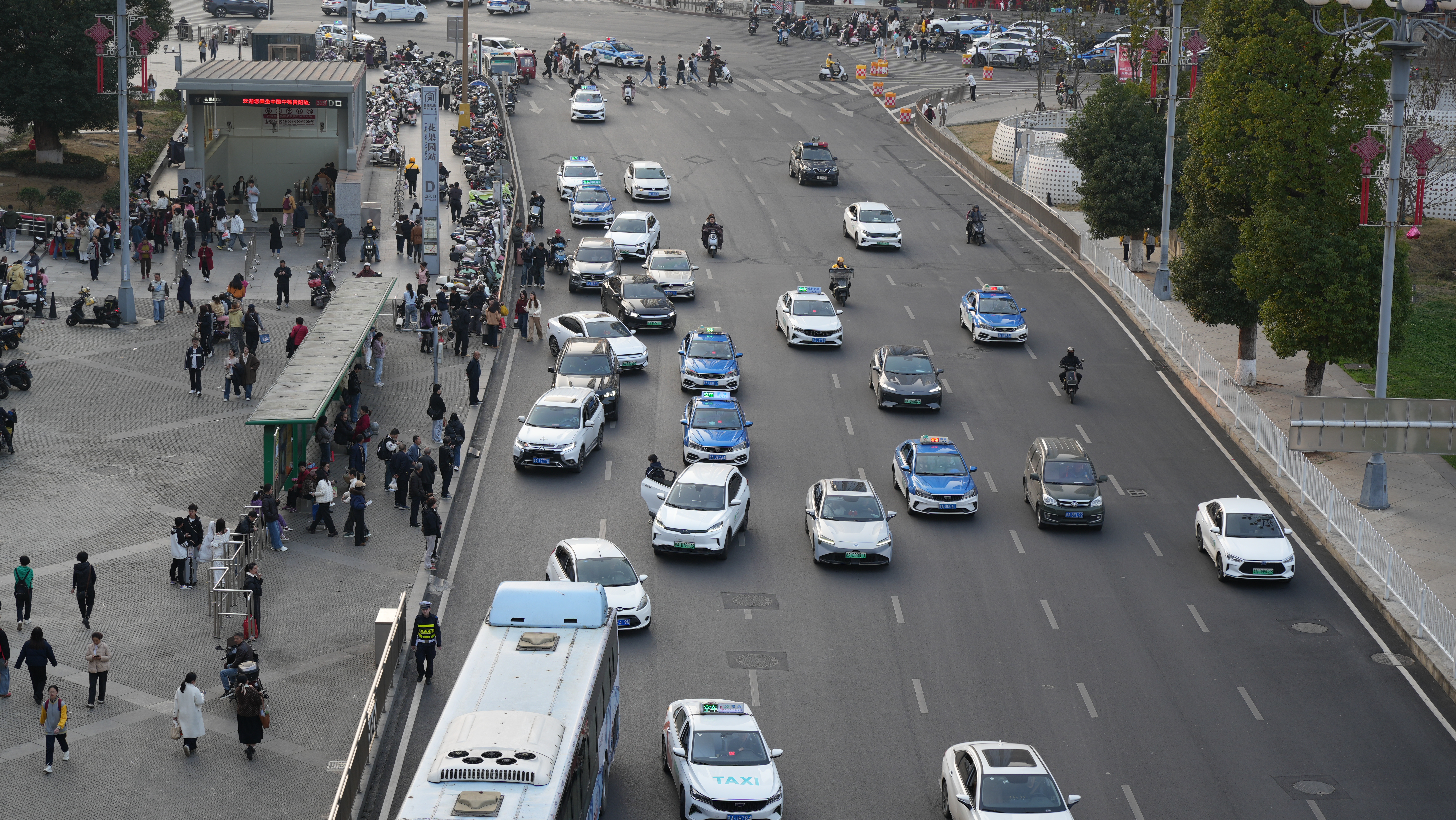 工作组还注意到,该公交站台前方约40米处,设有专门的出租车落客区,但鲜有车辆在此上下客。贵阳市公安局交通管理支队城区二大队七中队民警陈卫东说,该站紧邻海豚广场与地铁花果园站D出口,日常车流量大、乘客乘车需求高,因该路段目前不属于严管街,电子警察违停抓拍间隔在10分钟以上,部分出租车便利用这一时间差在此候客,社会车辆随意上下客现象较为普遍,导致公交车难以进站停靠。