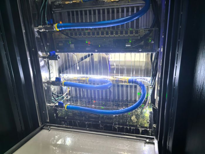 在戴端勤现场演示下,记者清晰看到,清透的冷却液在服务器内部精准流动、均匀喷淋,仿佛是在进行淋浴。该技术采用导热不导电的绝缘矿物油作为介质,可直接浸润核心设备,在高效降温的同时,杜绝导电、短路等安全隐患。