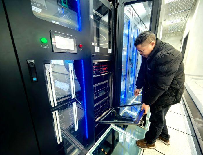 在该中心液冷运维负责人戴端勤的带领下,记者走进其中一间运行中的机房。与传统数据中心轰鸣、高热的高耗能制冷模式不同,这里设备运转平稳、噪声轻柔,一派静谧高效的运行景象。