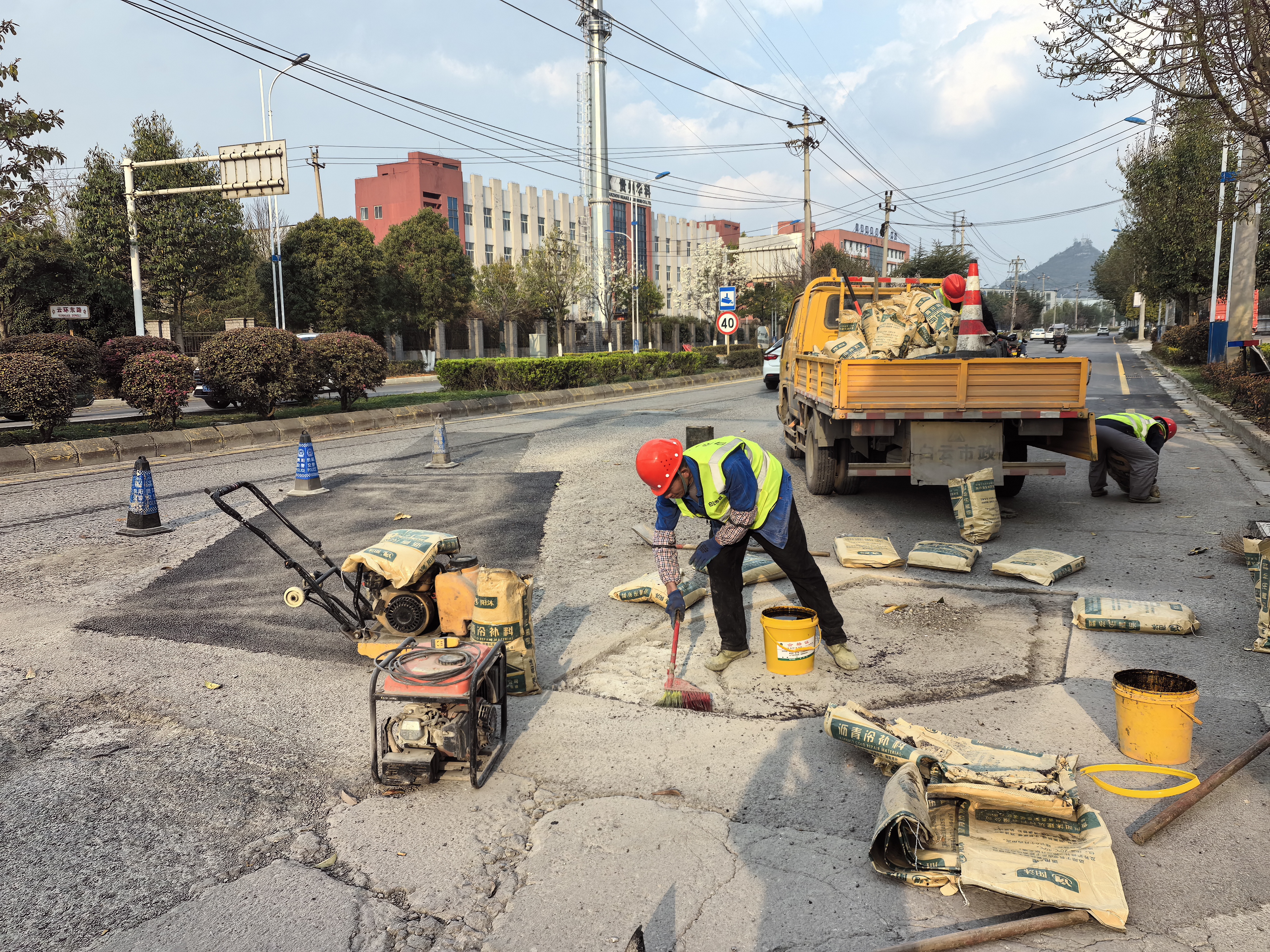 白云区市政维护管理所对云环东路上坑洼点进行修补。