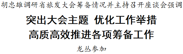 在随后召开的座谈会上,胡忠雄认真听取工作汇报。他强调,要加快完善工作方案,严格按照总体方案,进一步明确职责任务和时间节点,细化完善具体实施方案。要加快项目建设进度,在保证安全和质量的前提下,推动项目建设提速提效、如期完工。要加快重点活动准备,进一步梳理优化活动流程,确保开幕式各环节高效衔接、连贯有序。要加快业态招引管理,集中招引一批有品牌、有实力的文旅体企业,全力释放旅游消费潜力。要加快周边环境整治,优化道路交通组织,把各项工作做全做细,全力为旅发大会营造整洁、和谐的环境氛围。