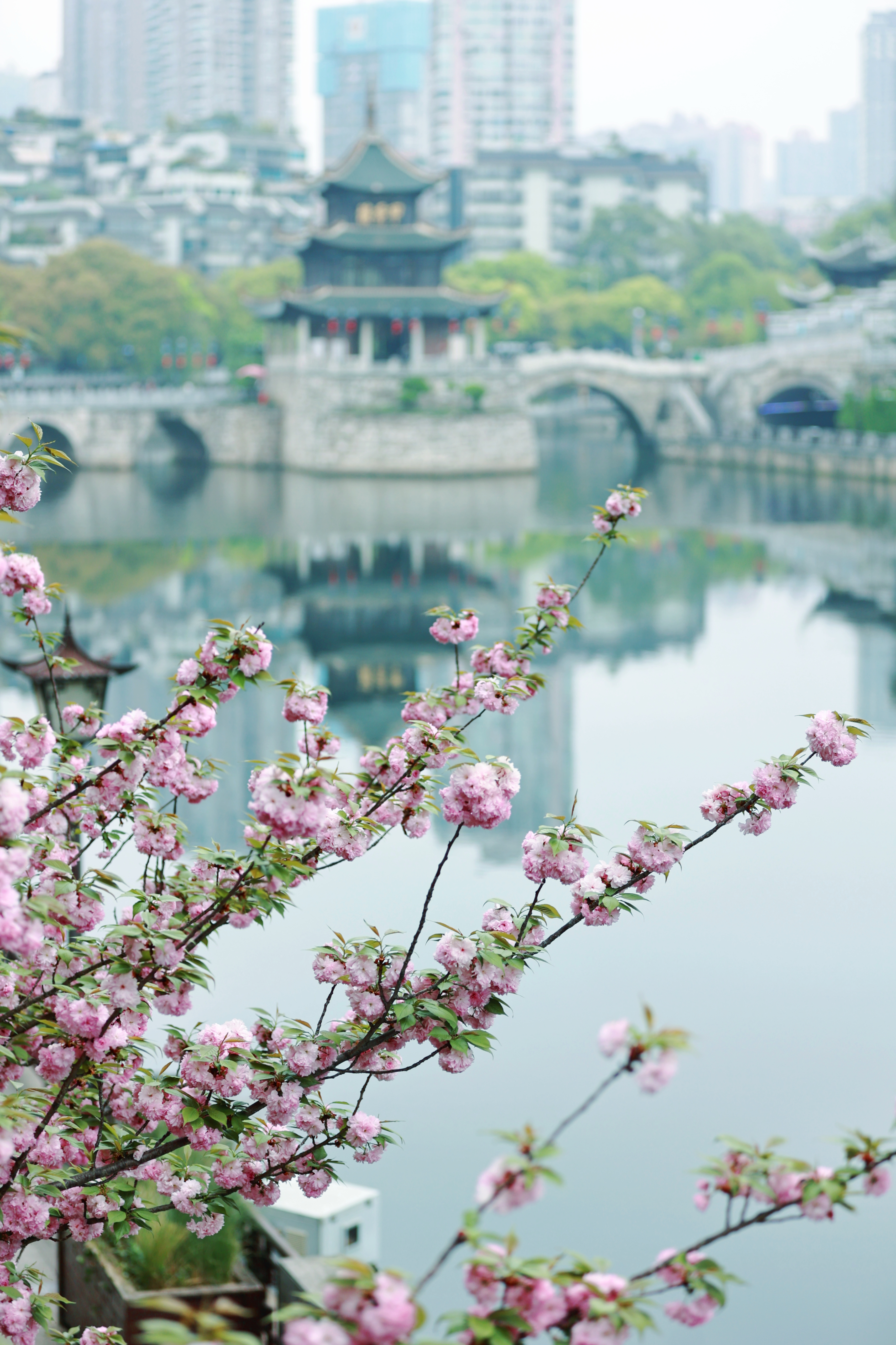 甲秀楼晚樱映南明河