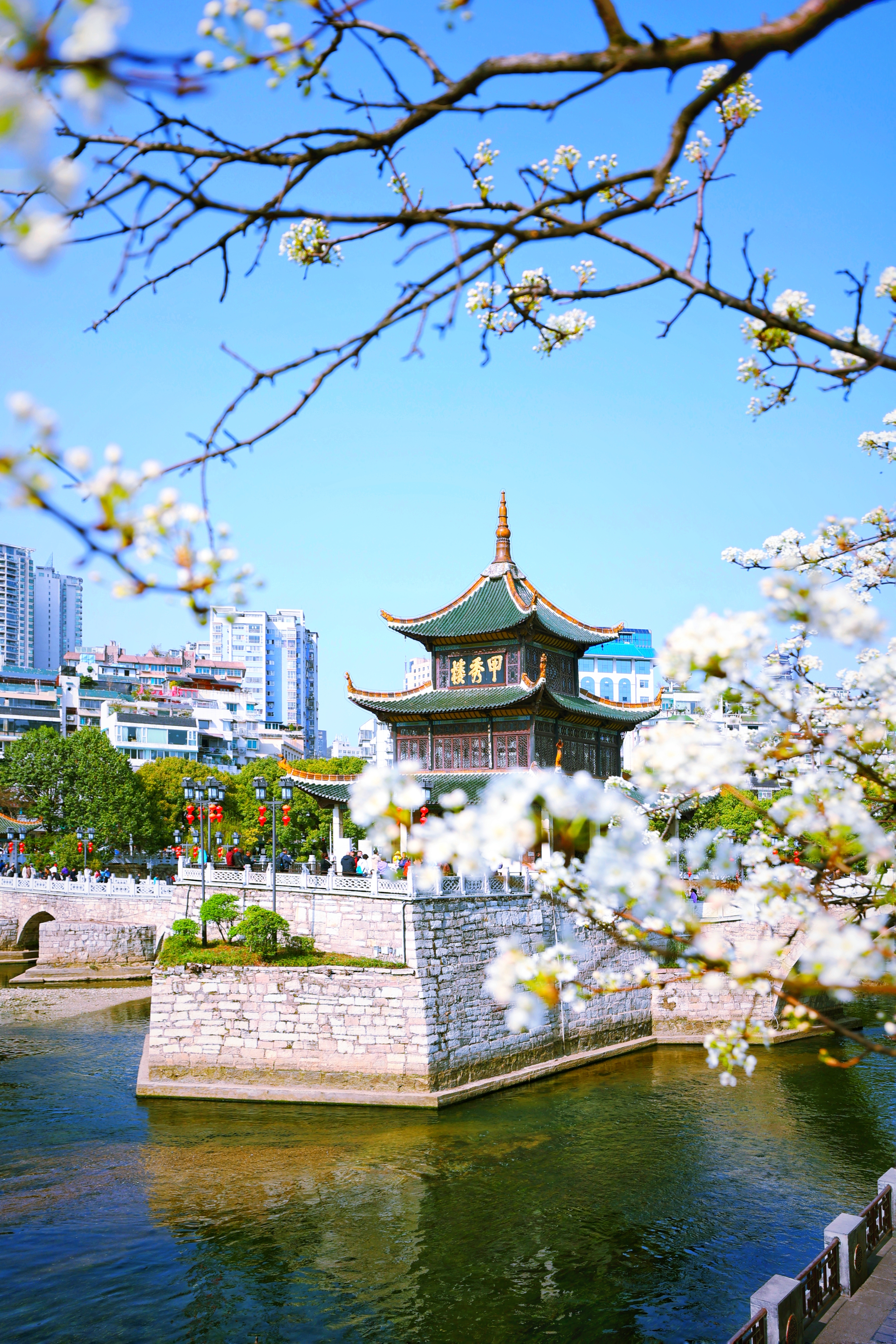 ▲甲秀楼旁,古楼,梨花,清清河水令人痴迷