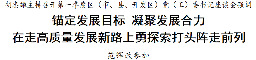 座谈会上,各区(市、县、开发区)党(工)委负责人围绕首季“开门红”、经营主体和科技创新等工作先后发言。在认真听取大家发言后,胡忠雄指出,要拿出跃马扬鞭的勇气,激发万马奔腾的活力,保持马不停蹄的干劲,全力以赴做好一季度经济发展工作,奋发有为实施创新驱动发展战略,精心培育壮大经营主体,以实干实绩在全省走新路、展风采中作出新的更大贡献。