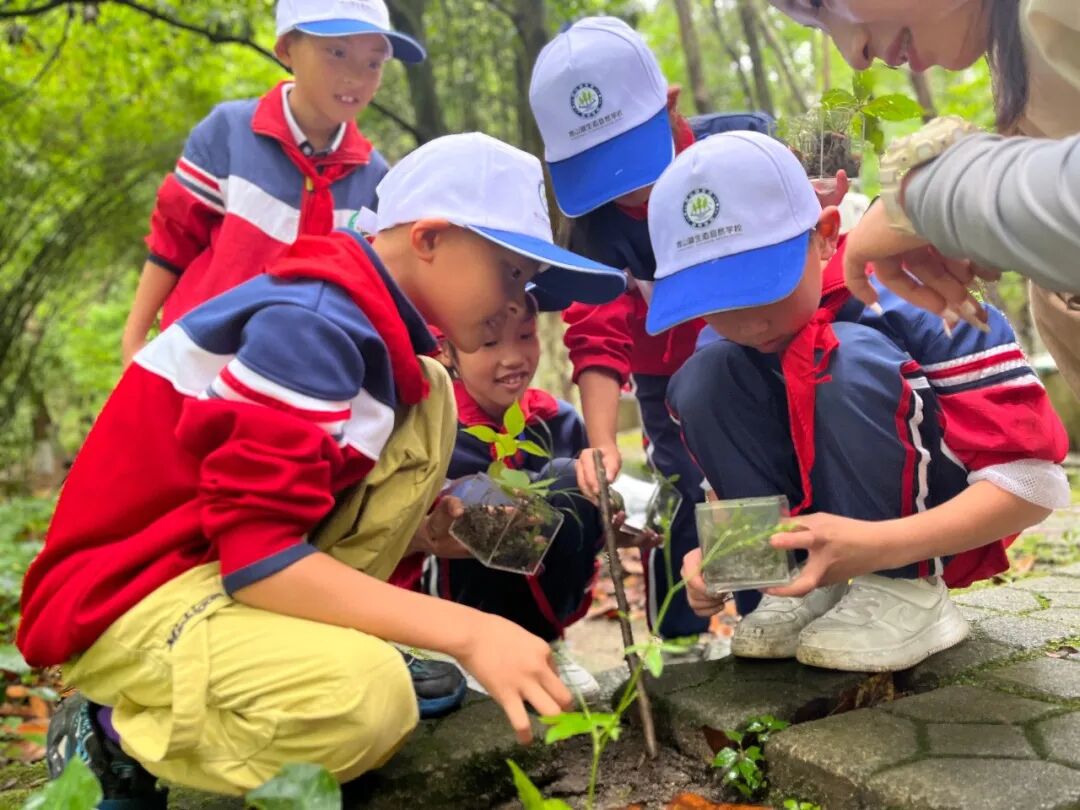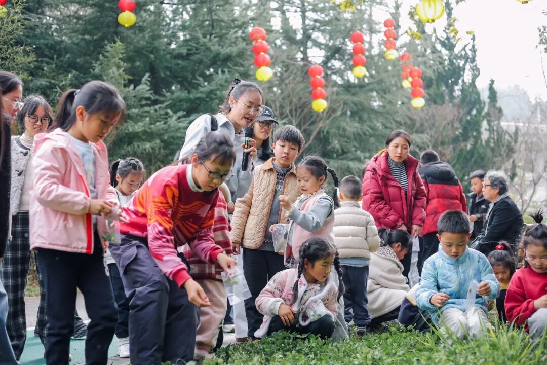 花草灯制作前,孩子们手持专属“生态寻宝图”,沿着展览馆旁的林荫小路寻找指定植物,聆听导师讲述植物与土地共生的故事。他们蹲在草丛边仔细观察蕨类植物卷曲的嫩芽,捡拾落叶时轻手轻脚、格外珍惜……初春的观山湖,化作最生动的自然教室,让孩子在行走间触摸自然肌理,感知生态律动。
