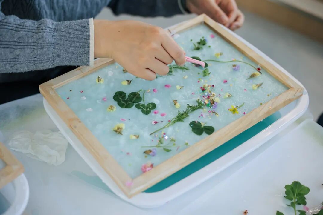 在手工环节中,孩子们将捡拾的落叶、花朵精心铺在湿纸膜上,再均匀覆上一层纸浆,一张张封存着春日印记的花草纸便在指尖诞生。在这个过程中,非遗不再是书本上的文字,而是可以触摸的树皮纤维、可以嗅到的草木清香,传统技艺与自然之美在此刻交融,文化传承如春风化雨,浸润童心。