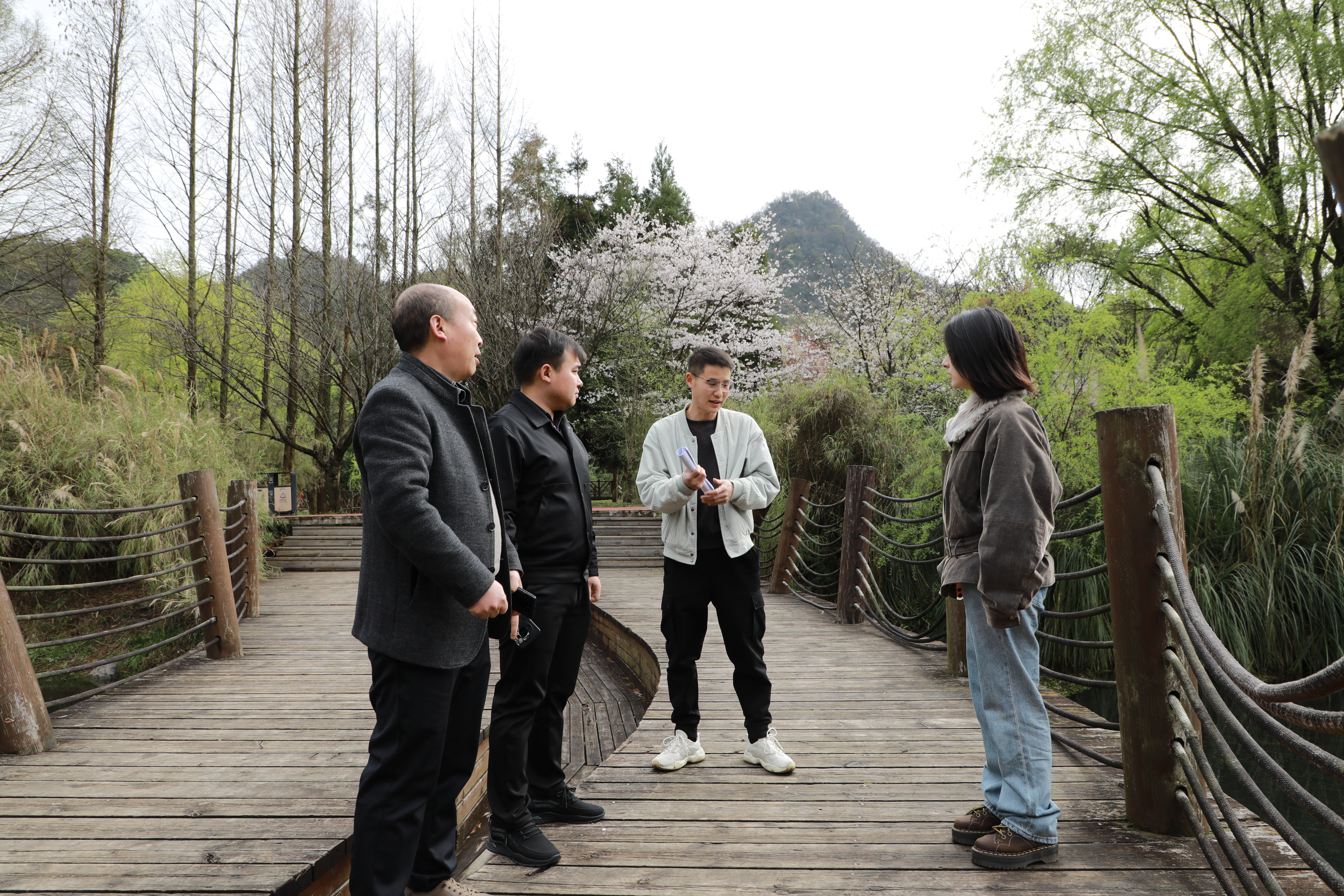 贵阳市花溪国家城市湿地公园管理处工作人员(左一、左二、左三)介绍情况