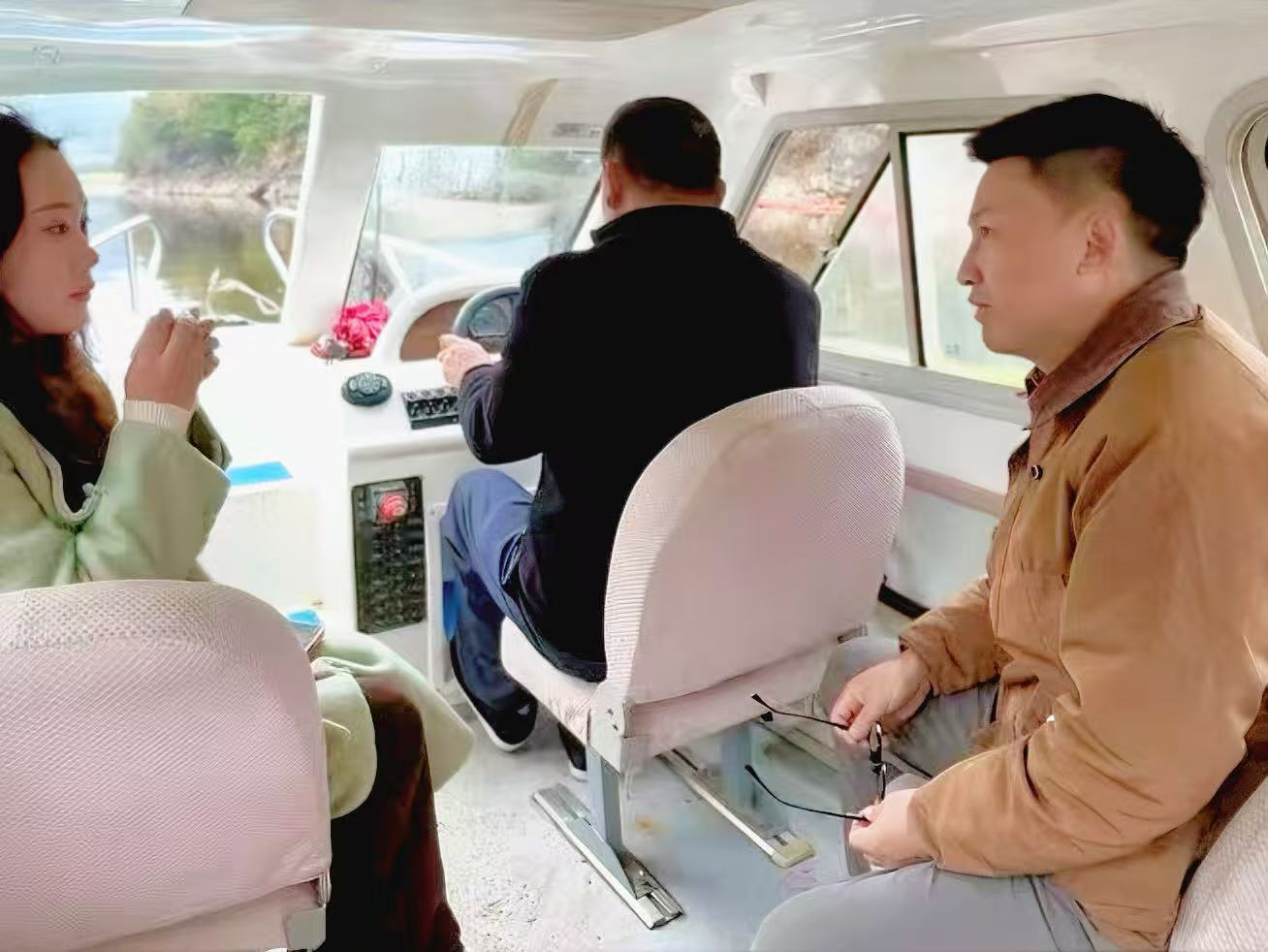 贵阳市水务管理局两湖一库管理处处长谢太岭(右一)在巡查船上介绍百花湖死鱼事件处置情况