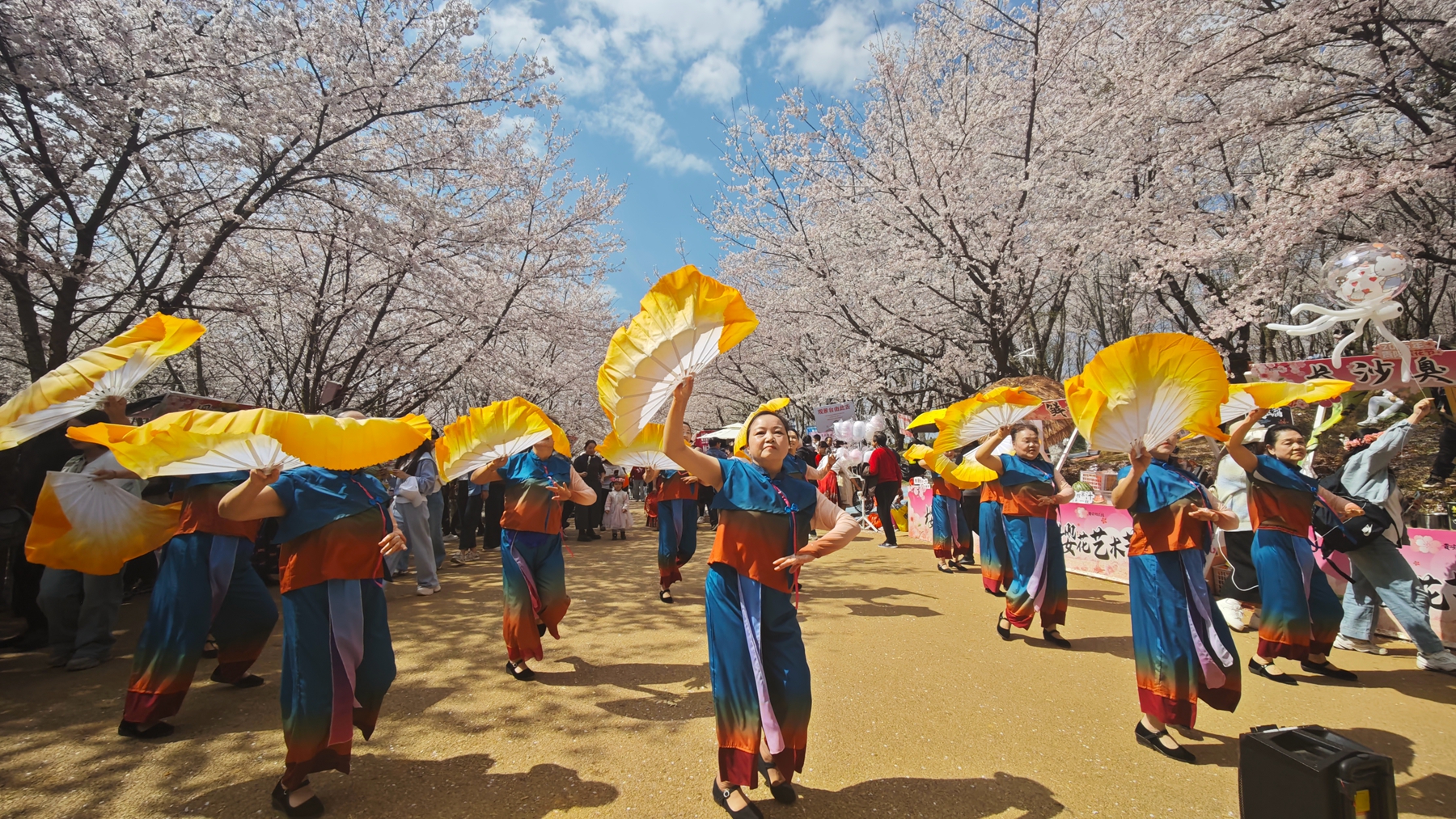 一阵春风吹过,园内樱花花瓣纷纷扬扬飘落,下起了一场浪漫的“樱花雨”。这突如其来的美景让现场气氛瞬间沸腾。在漫天花瓣的映衬下,在场游客抛开羞涩,与演员们踏着欢快的节拍尽情舞动。现场成为一片欢乐的海洋,笑声、歌声与花瓣交织在一起,构成了一幅动人的春日画卷。