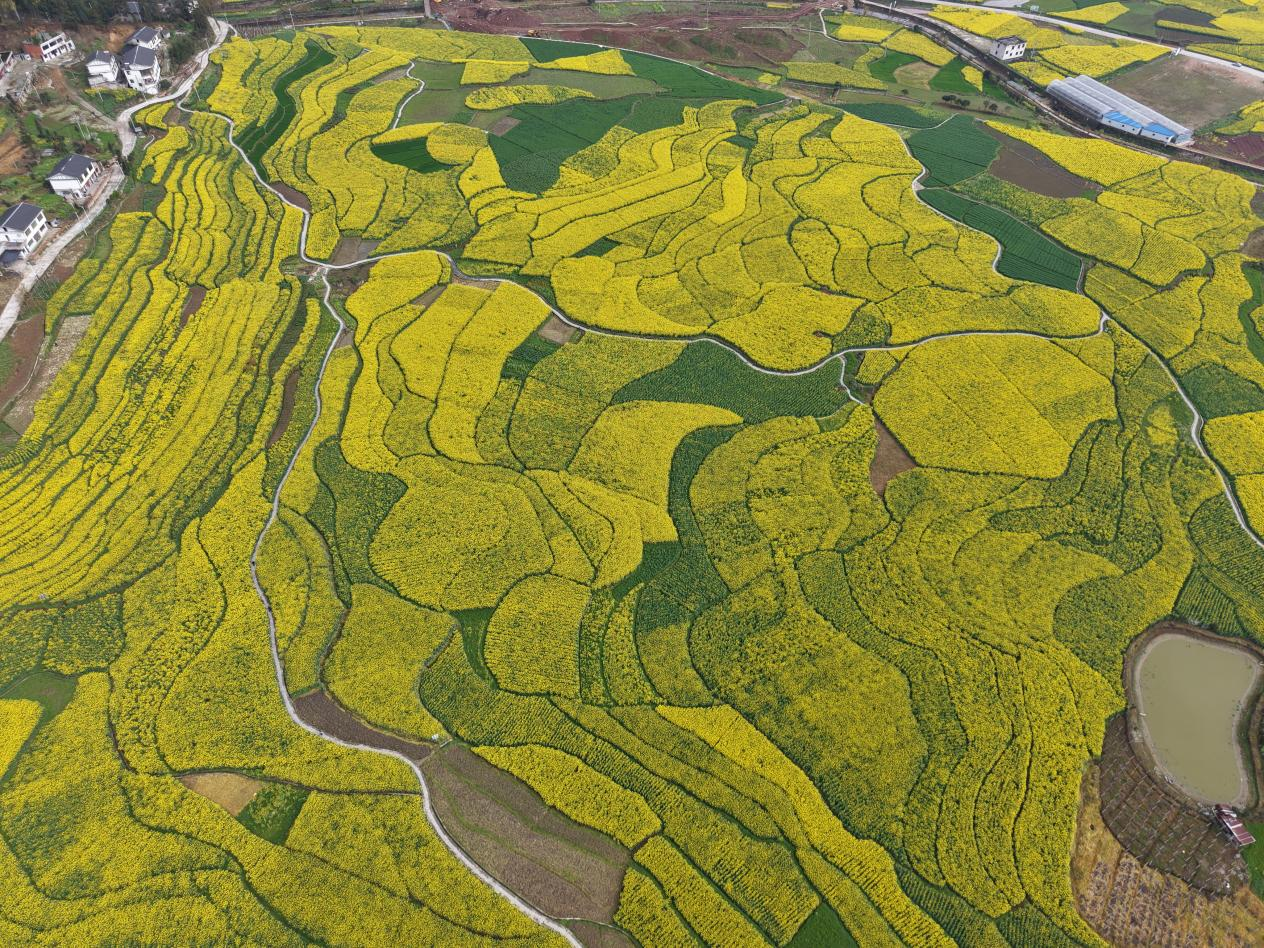 九庄镇连片油菜花海核心区,金黄花田顺着地势铺展,微风拂过花浪翻滚,花香浓郁,乡野气息十足。人少清净,适合自驾途经打卡,沉浸式感受原生态田园春光。