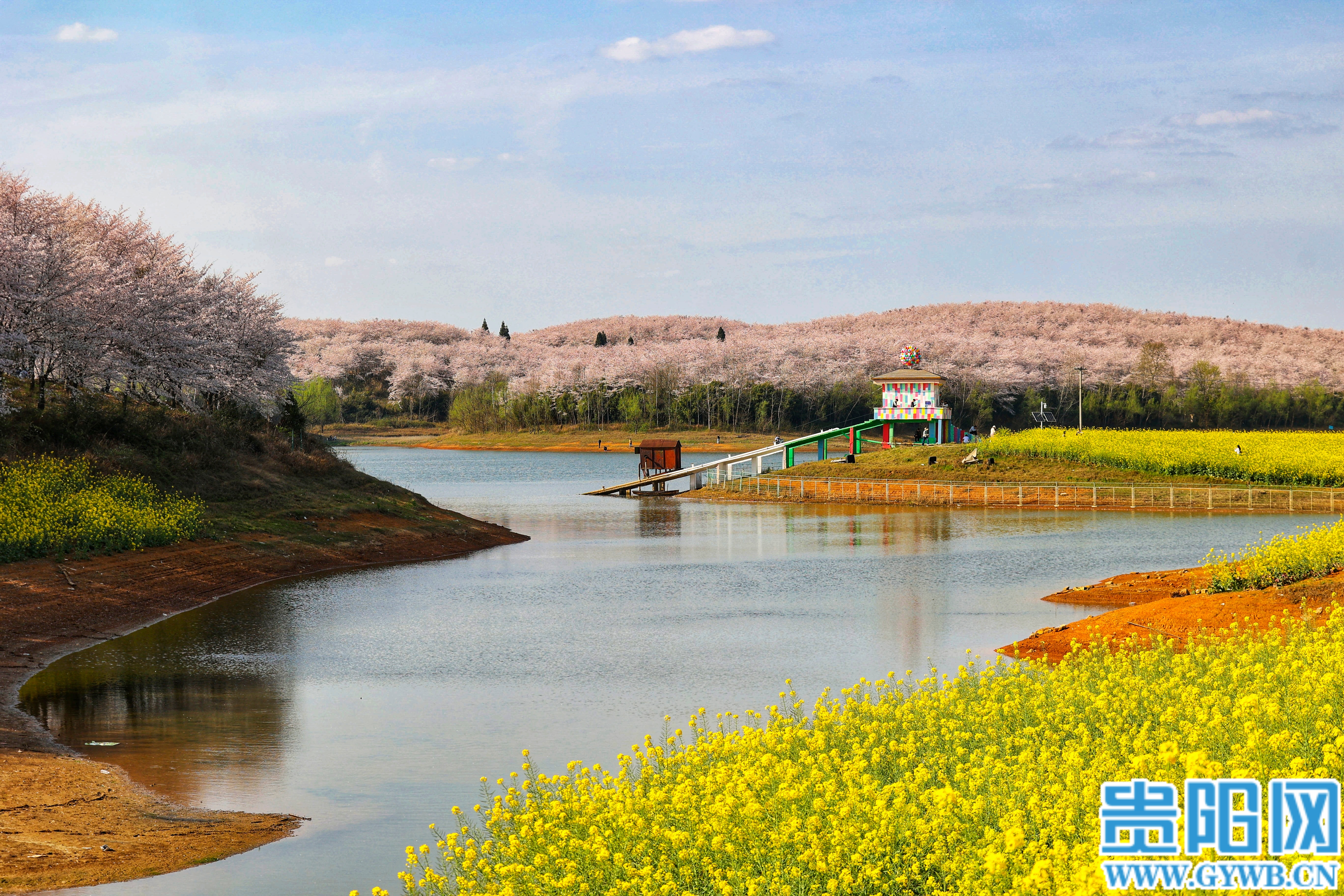 贵安樱花园与湖潮乡芦猫塘村仅十余分钟步程,今年,芦猫塘村精准承接樱花园外溢客流,将油菜花种植规模从120亩扩大至200亩,金黄花海与远处粉色樱花、波光粼粼的红枫湖相映成趣,构成层次分明的山水画卷。为了让游客从“看花”升级为“玩花”,村里在花田间精心打造多处创意打卡点:还原《飞屋环游记》的“网红气球屋”色彩斑斓,仿佛随时腾空而起;充满乡土气息的彩绘墙以农耕生活为主题,绘出鲜活乡村故事;粉红色木屋与相框式装置与樱花花海遥相呼应,游客随手一拍便是春日大片。“我们就是想通过这些创意,把樱花园的游客留下来,让他们真正体验乡村生活。”芦猫塘村相关负责人说道。