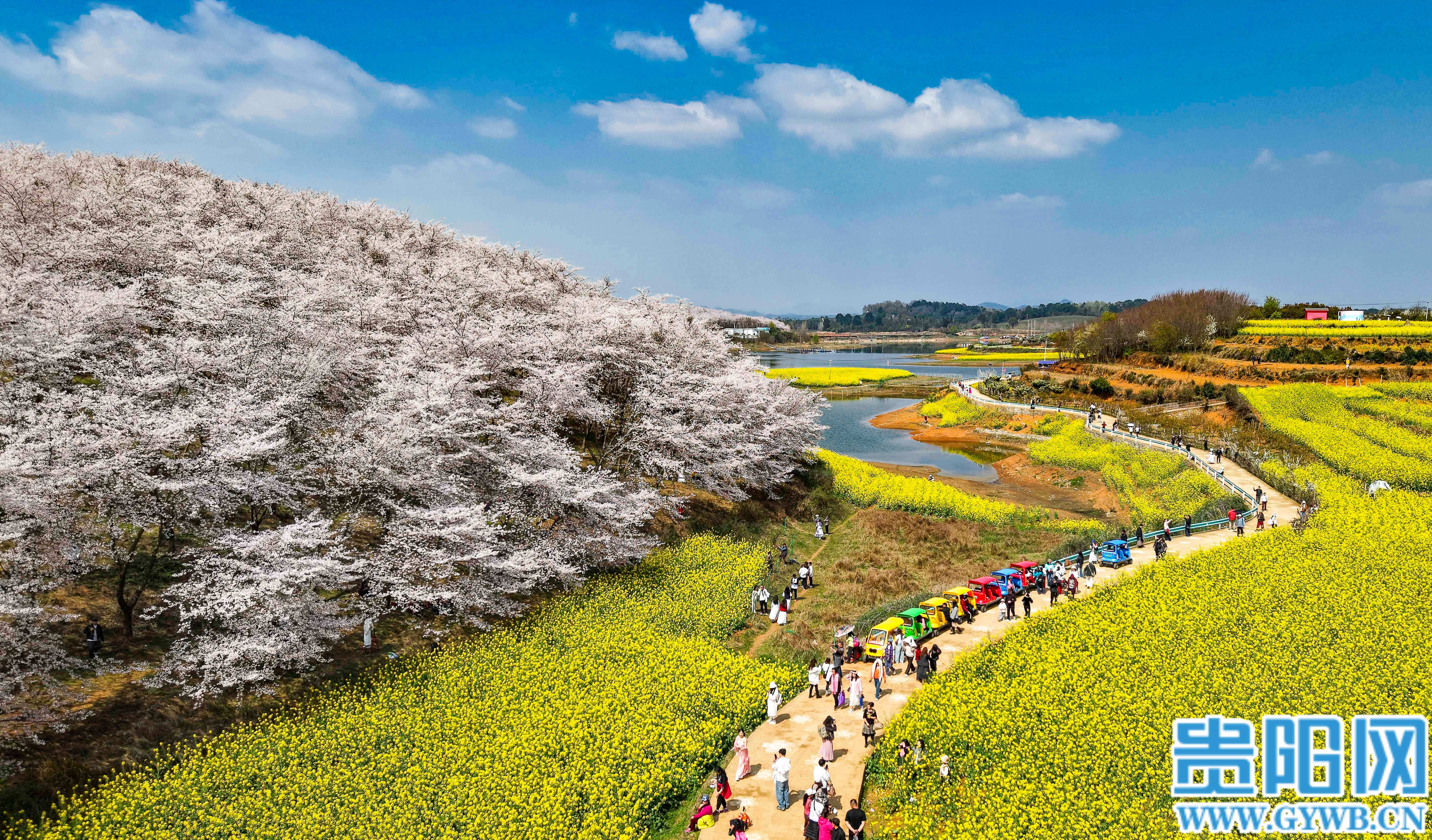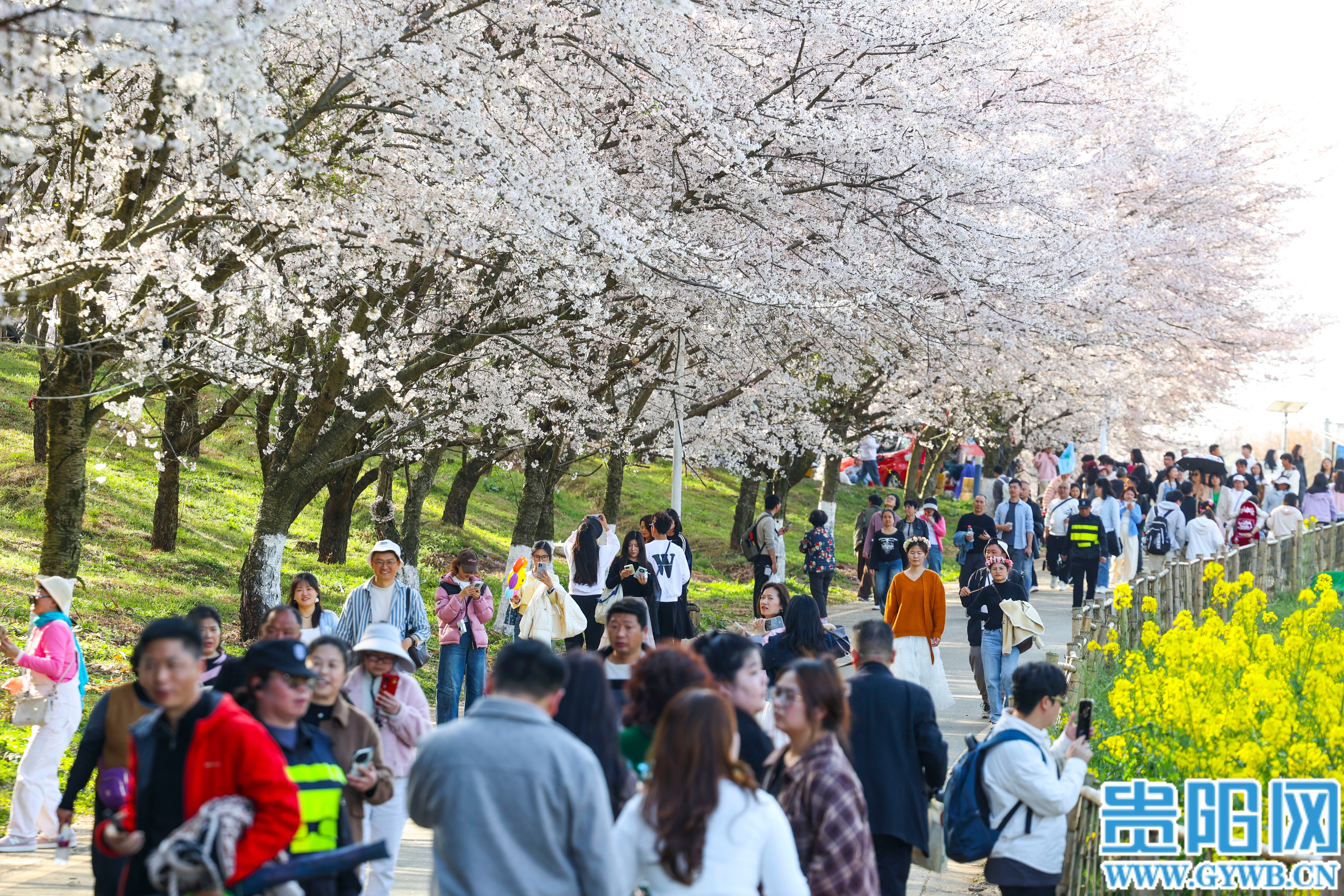 “樱花开遍贵安地,菜花金黄映湖水,没想到逛完樱花园,几步路就能遇到这么美的景色!”来自广东的游客王女士站在芦猫塘村的油菜花田间,举着手机定格下“樱花、湖水、菜花”同框的绝美瞬间。 一朵樱花,不仅点亮了贵安樱花园的春日盛景,更成为撬动乡村振兴的“金钥匙”,为周边乡村带来源源不断的客流,让村民们在家门口吃上了热乎乎的“旅游饭”。