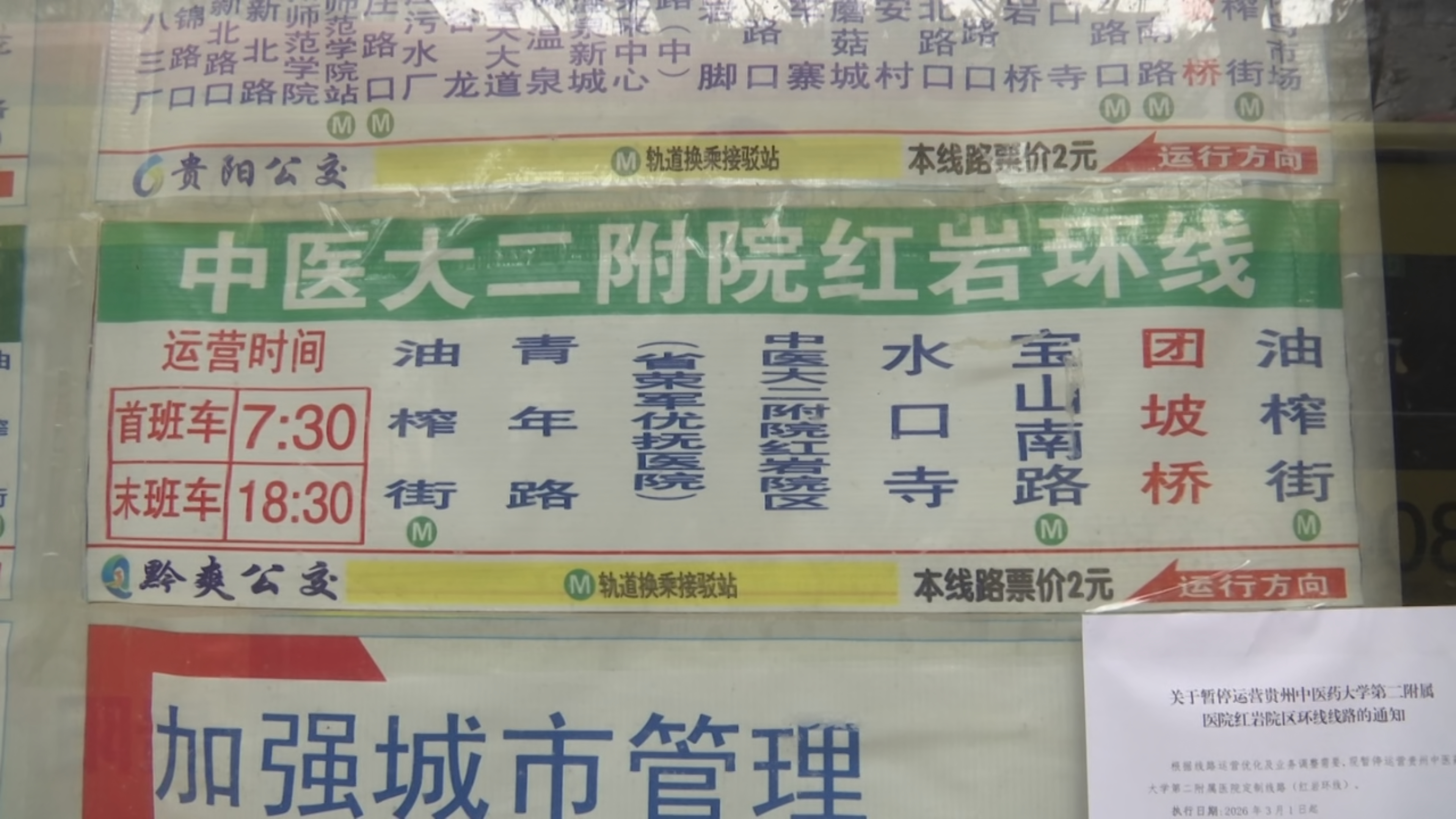 站牌旁张贴“关于暂停运营贵州中医药大学第二附属医院红岩院区环线线路的通知”