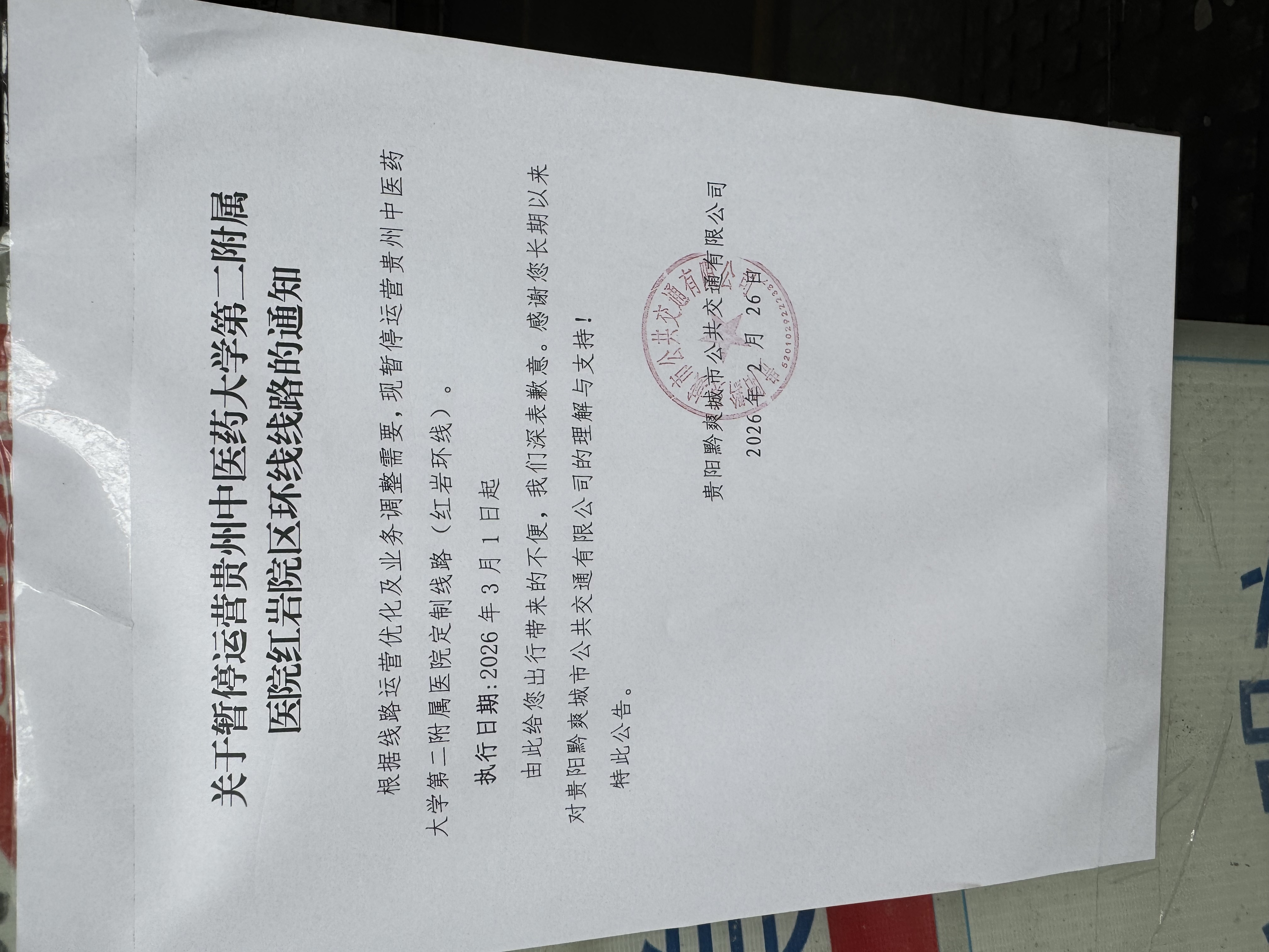 “融媒+督查”工作组在现场看到,该站点站牌旁贴有一则《关于暂停运营贵州中医药大学第二附属医院红岩院区环线线路的通知》,明确因线路运营优化及业务调整需要,该定制线路(红岩环线)自2026年3月1日起暂停运营。