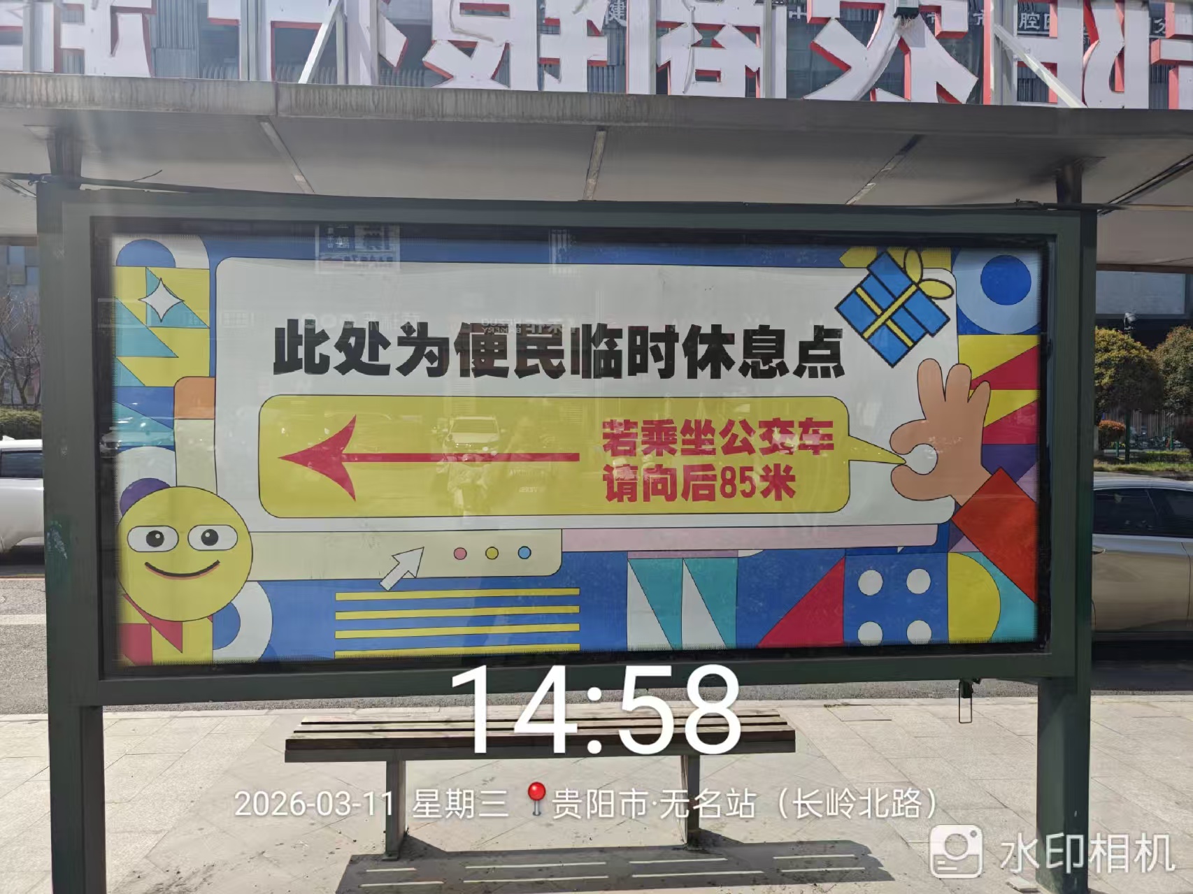 3月11日,工作组再次回访看到,闲置公交站台雨棚的广告位已增设醒目标识牌,清晰标注“此处为便民临时休息点,若乘坐公交车请向后85米”的提示,并标注箭头指向正规公交站点,方便市民乘车。贵阳市融媒体中心记者 杨轲丹 陈煜文