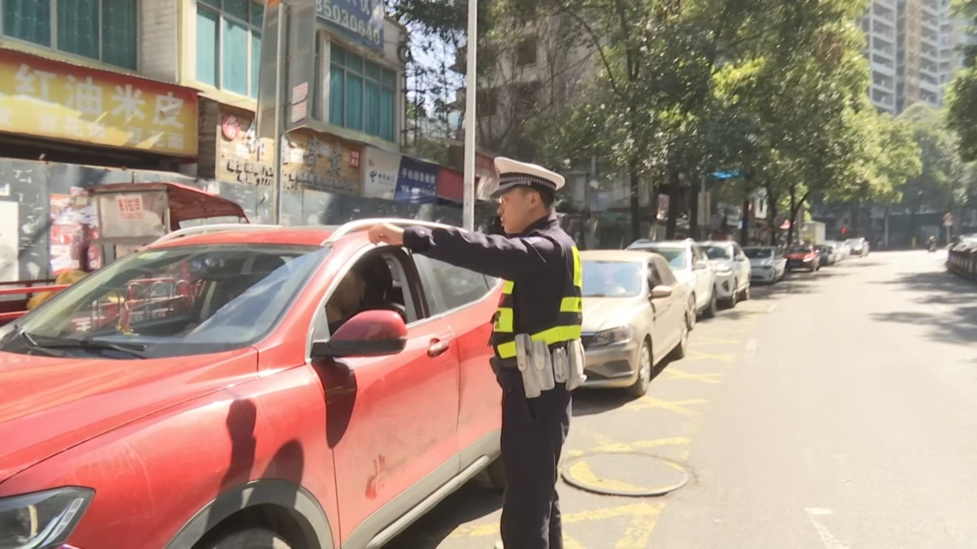贵阳市公安局交管支队一大队一中队指导员孙啸引导车辆不要在黄色网状线上停车