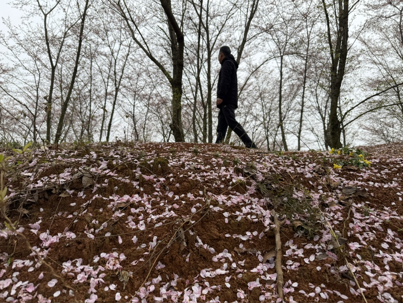 受近期降温天气影响,园区气温偏低,花瓣飘落速度加快,已无盛花期漫天花海的壮观景象,而林间地面被粉白落樱铺成浪漫“花毯”依然让前来的游客感受到别具风味的诗意。
