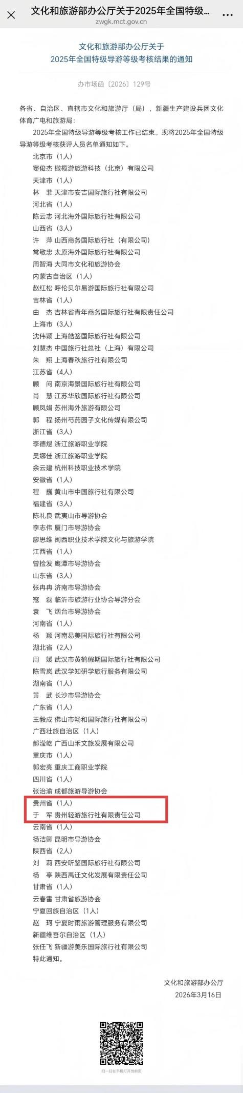 贵阳网·贵阳新闻讯 3月16日,文化和旅游部公布2025年全国特级导游名单,全国共有41位导游获评特级导游。其中,贵州轻游旅行社有限责任公司导游于军成功入选,成为贵州历史上首位全国特级导游,填补了贵州该领域的空白。