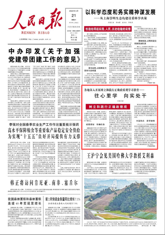 3月21日,《人民日报》头版刊发稿件《各地深入开展树立和践行正确政绩观学习教育——往心里学 向实处干(树立和践行正确政绩观)》,其中提到贵州省贵阳市聚焦教育、金融、非公有制经济组织和社会组织等行业领域,精准送学。依托线上平台组织自主学习,发挥先进典型示范作用,让身边人讲身边事,多措并举让学习内容更精、形式更活、效果更实。