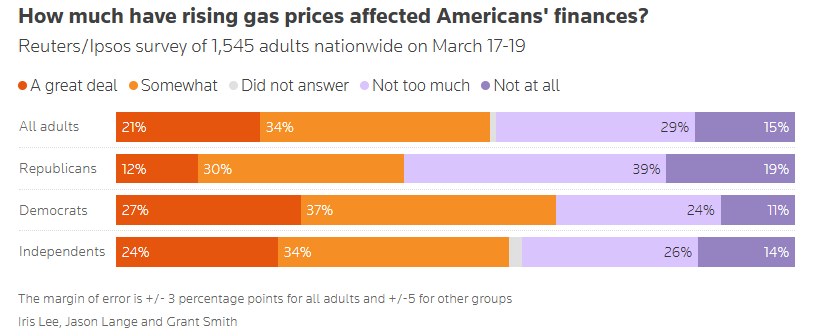 路透社3月20日援引路透社/益普索最新民调显示,随着美以伊冲突推高油价,战争带来的压力已开始直接冲击美国家庭。55%的受访者表示,油价上涨已经影响家庭财务状况,其中21%称影响“很大”,而87%的美国人预计,未来一个月油价还将继续上行。