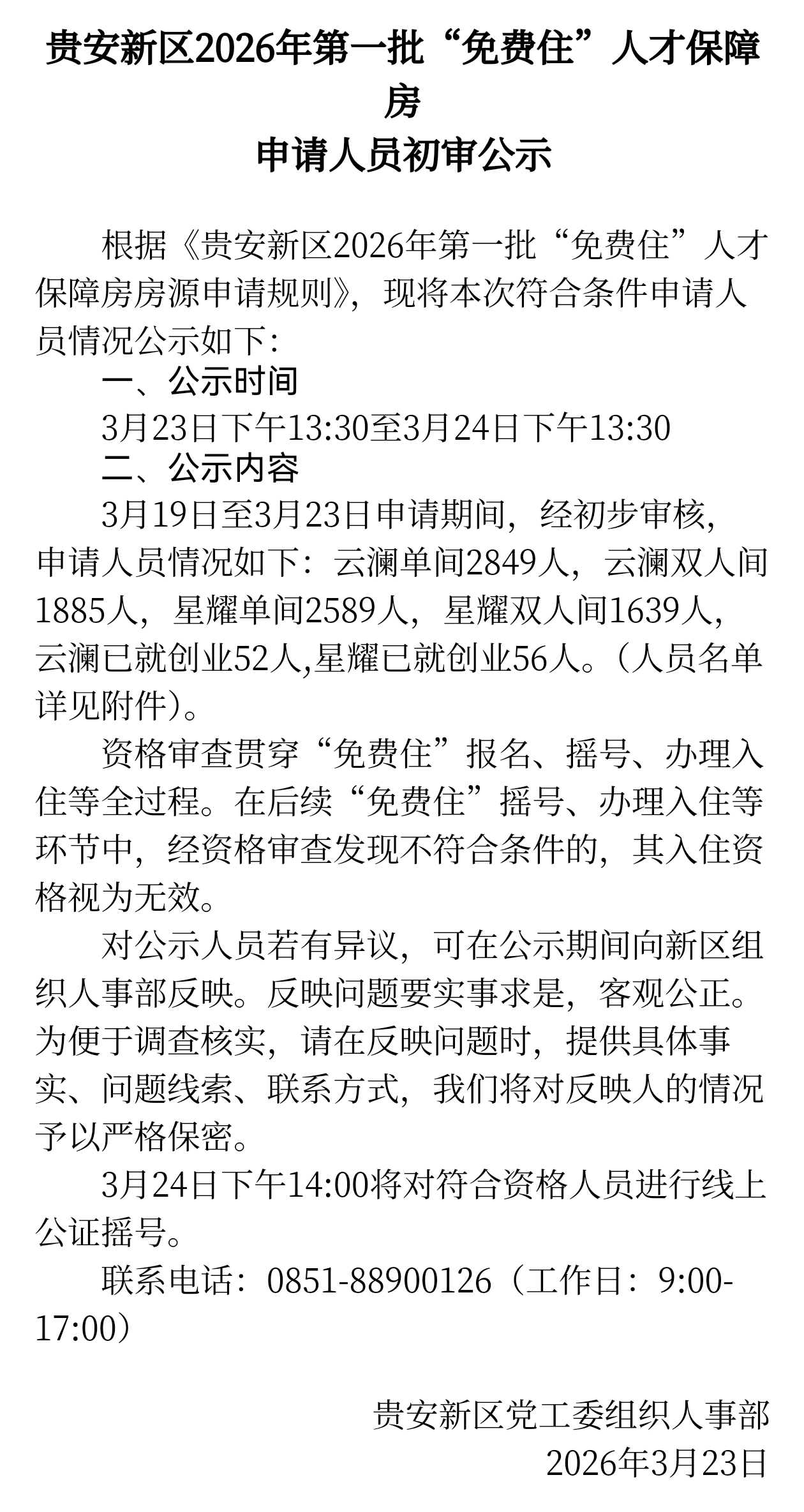 贵阳网·贵阳新闻讯 3月23日中午,贵安新区党工委组织人事部公示2026年第一批“免费住”人才保障房申请人员初审名单,9070人次初步通过资格审核。3月24日14:00将进行线上公证摇号。