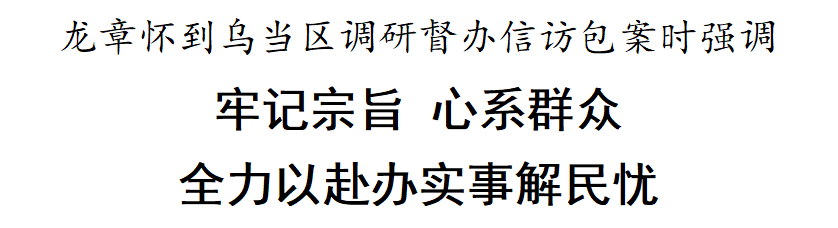 贵阳网·甲秀新闻讯 3月24日,市政协党组书记、主席龙章怀赴乌当区调研督办信访包案。他强调,要深入学习贯彻习近平总书记关于加强和改进人民信访工作的重要思想、关于树立和践行正确政绩观的重要论述,牢记宗旨、心系群众,全力以赴办实事、解民忧。