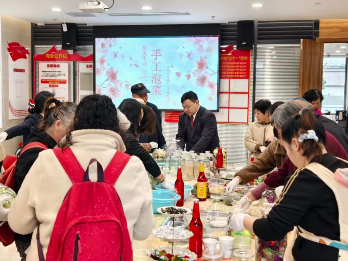 活动现场,支行工作人员提前备齐新鲜蔬菜、调味酱料及密封罐等各类物料,精心布置操作台与互动区域,通过清晰的流程指引和细致温馨的提示,让每位参与者能轻松参与、放心制作。活动伊始,工作人员详细讲解泡菜制作步骤,从食材处理、分层装罐到盐水调配,逐一示范操作要点,并耐心解答居民疑问,大家在动手实践中感受传统美食文化的独特魅力。