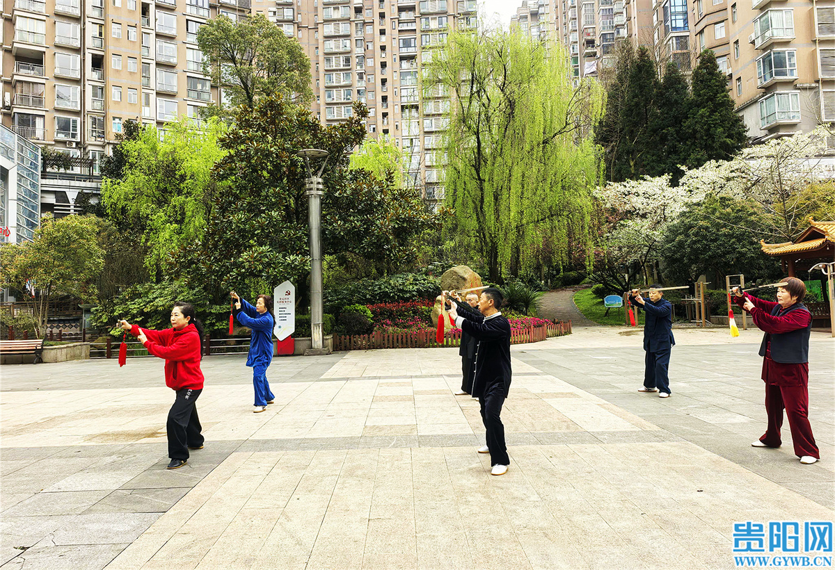 3月24日早上9时许,仲春的观山湖区还有些微凉,来到金元社区广场,却是一气热闹的场景——在悠扬的音乐声中,数十名打太极剑的居民起舞弄剑,动作飘逸洒脱,刚柔并济;另一旁,几位居民正在打着太极拳,一招一式,如行云流水,舒展从容。广场的另一角,几位带着孩童的家长或低语交流,或与孩童逗乐,整个广场活力满满,温馨和谐。