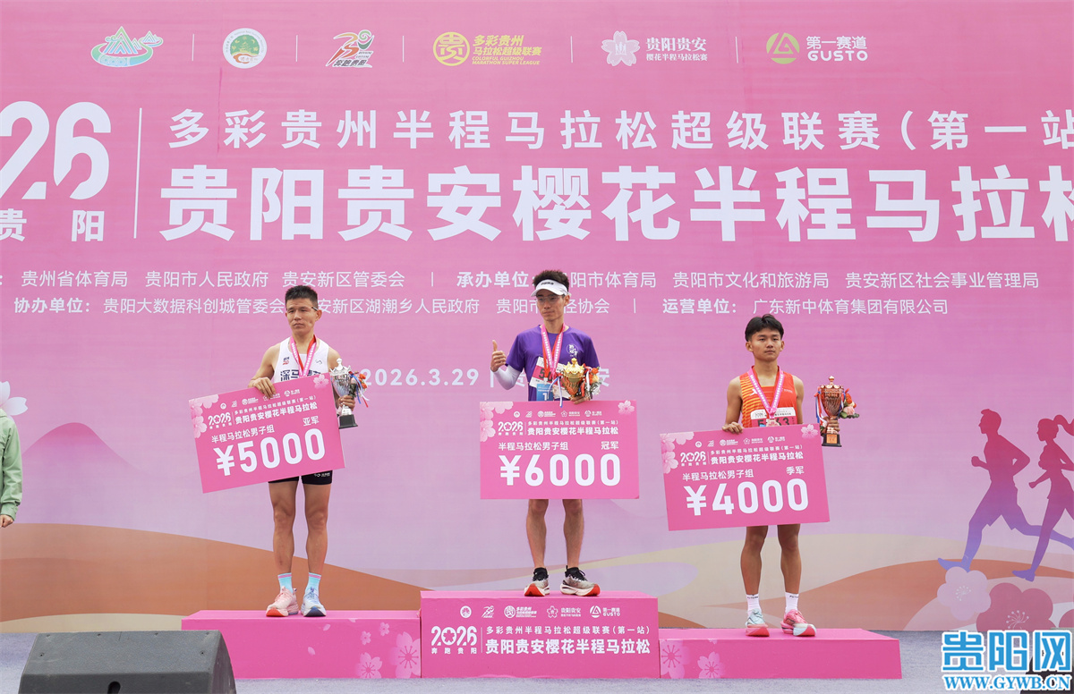 春意盎然,樱花烂漫。3月29日上午9时,2026多彩贵州半程马拉松超级联赛(第一站)暨贵阳贵安樱花半程马拉松在贵安新区鸣枪开跑,选手张树、张珊珊分获男子组、女子组冠军。