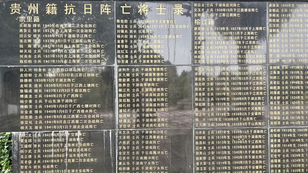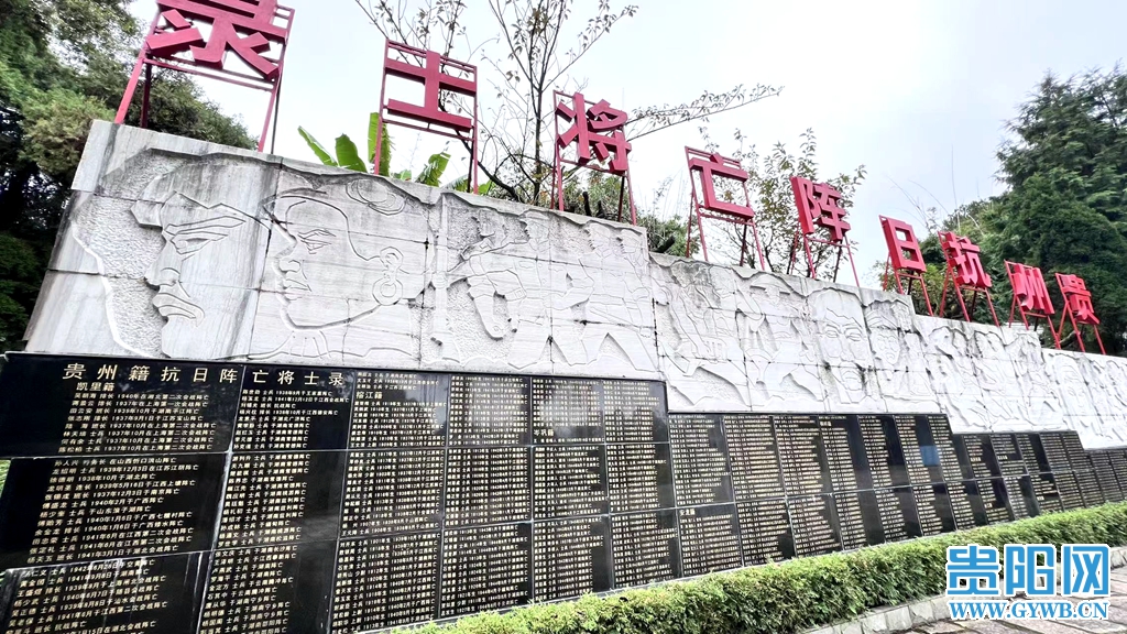 园内,23米高的贵州人民抗日战争纪念碑巍然矗立。它以步枪为原型,底部却化作“犁”的形状,汉白玉和平鸽停驻其上——“化剑为犁”,这是先辈用生命换来的和平祈愿。碑体上,贵阳第一任市委书记、市长秦天真题写的11个大字鲜红如血。两侧的石碑上,2471名贵州籍抗战英烈姓名静静排列,年纪最小的仅16岁。